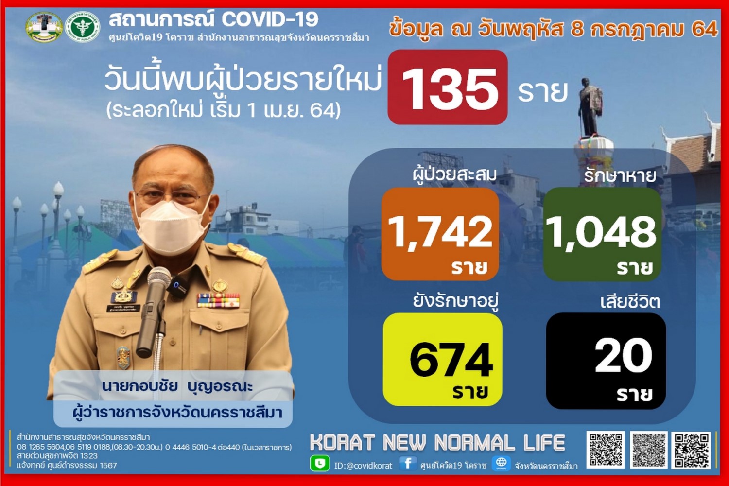นายกอบชัย บุญอรณะ ผู้ว่าราชการจังหวัดนครราชสีมา แถลงสถานการณ์โควิด-19 วันนี้ (8ก.ค.)พบพบผู้ป่วยรายใหม่ 135 รายในจำนวนนี้ เดินทางมาจากจังหวัดพื้นที่เสี่ยง 51 รายได้แก่ กรุงเทพมหานคร 26 ราย , นนทบุรี 3 ราย ,ปทุมธานี 10 ราย ,สมุทรปราการ 5 ราย , นครปฐม 3 ราย ,ชลบุรี 1 ราย ,พระนครศรีอยุธยา 2 ราย และ จ.เลย 1 ราย นอกนั้น เป็นสัมผัสผู้ป่วยโควิด 19 จำนวน 40 ราย , เป็นผู้ป่วยโควิด เดินทางกลับมารักษาในภูมิลำเนา จ.นครราชสีมา จำนวน 31 ราย และอยู่ระหว่างการสอบสวนโรคอีก 13 ราย ทำให้ยอดผู้ป่วยยืนยันสะสมอยู่ที่ 1,742 ราย รักษาหายแล้ว 1,048 ราย ,ยังรักษาอยู่ 674 ราย และเสียชีวิตแล้ว 20 ราย
