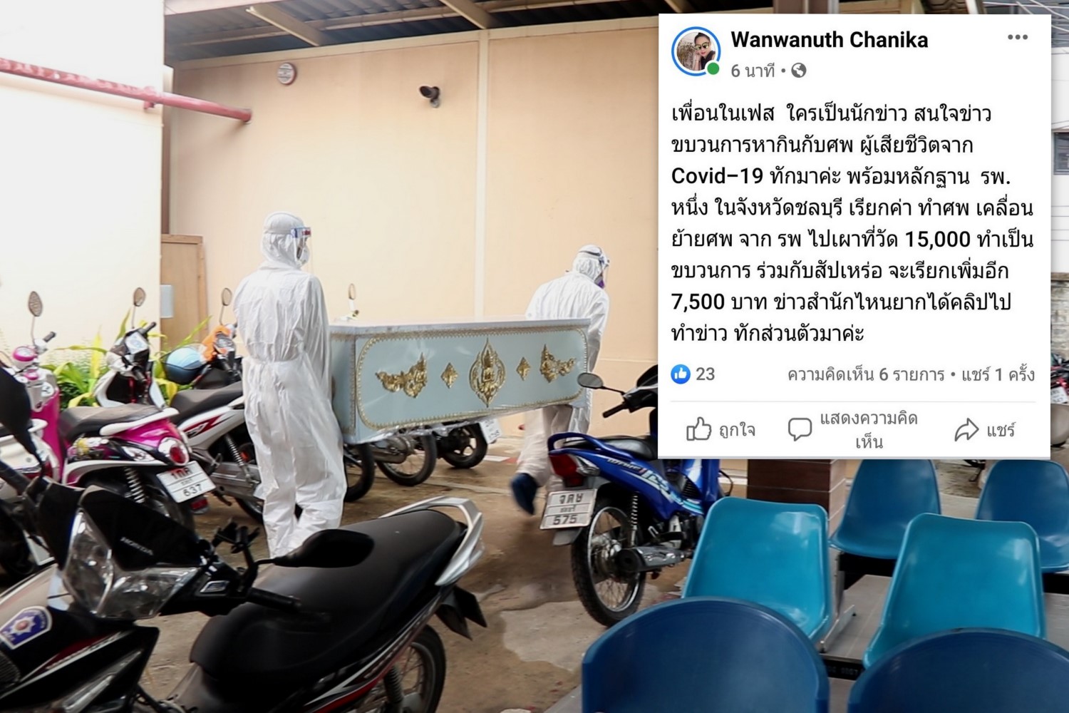 เมื่อวันที่ 14ก.ค.64 โลกโซเชียลมีกระแสวิพากษ์วิจารณ์กรณีผู้ใช้เฟซบุ๊กชื่อ Wan wanuth Chanika ได้โพสต์ข้อความระบุมีขบวนการหากินกับศพผู้เสียชีวิตจากโควิด-19โดยรพ.หนึ่งในจังหวัดชลบุรี เรียกค่าทำศพ เคลื่อนย้ายศพจา รพ.ไปเผาที่วัด 15,000 บาทและจะร่วมกับสัปเหร่อ จะเรียกเพิ่มอีก 7,500 บาท สื่อข่าวสำนักไหนอยากได้คลิปไปทำข่าวขอให้ทักส่วนตัวมา ลและพบว่ามีประชาชนเข้ามาแสดงความคิดเห็นกันเป็นจำนวนมาก