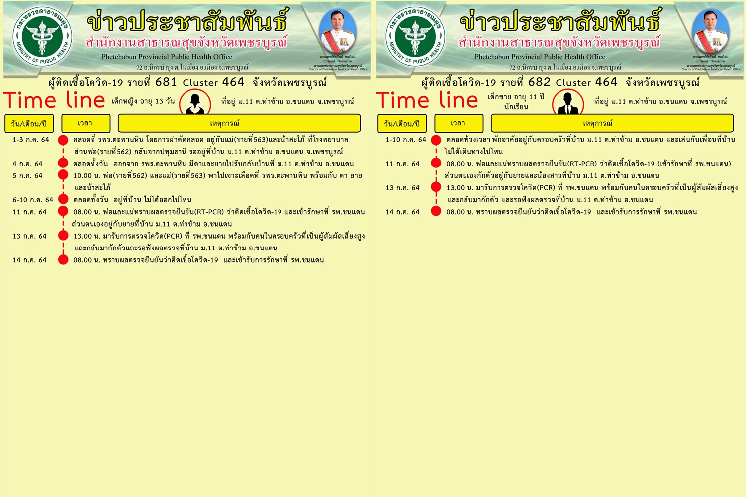 ศูนย์ปฏิบัติการโควิด-19 จ.เพชรบูรณ์ เผยแพร่ไทม์ไลน์ผู้ติดเชื้อรายใหม่ วันที่ 15 กรกษาคม 2564 จำนวน 59 ราย (รายที่ 667- 725) แยกเป็นผู้ติดเชื้อนอกพื้นที่ขอเข้ามารักษาในจังหวัดจำนวน 53 ราย ส่วนผู้ติดเชื้อในจังหวัดมีจำนวน 6 ราย ในจำนวนมีรายที่ 681 ซึ่งผู้ติดเชื้อเป็นทารกเพศหญิงวัยเพียง 13 วันซึ่งนับเป็นผู้ติดเชื้อรายแรกในพื้นที่ที่มีอายุน้อยที่สุด