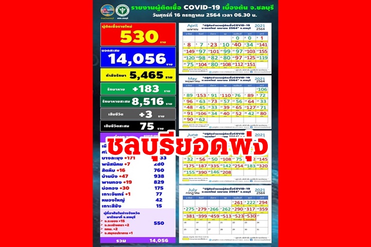 เมื่อวันที่ 16 ก.ค. 64 สำนักงานสาธารณสุขจังหวัดชลบุรี รายงานว่า วันนี้มีผู้ติดเชื้อโควิด-19 รายใหม่ จำนวน 530 ราย เสียชีวิต 3 ราย รวม 75 ราย