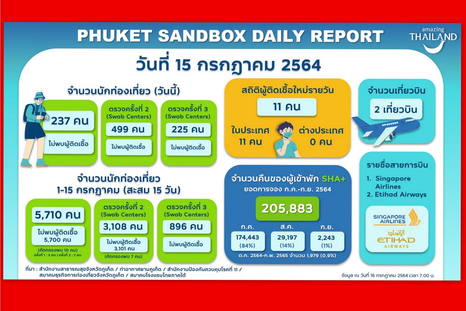การดำเนินงานโครงการ Phuket Sandbox ระหว่างวันที่ 1-15 กรกฎาคม 2564 มี นักท่องเที่ยวต่างชาติ เดินทางเข้ามาจำนวน 5,710 คน ในจำนวนนี้ตรวจคัดกรองพบเชื้อโควิด-19 จำนวน 10คน มียอดจองเข้าพักโรงแรมที่ได้มาตรฐานSHA Plus เดือนกรกฎาคมถึงเดือนกันยายน2564 จำนวน 205,883 ห้อง