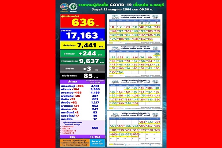 เมื่อวันที่ 21 ก.ค. 64 สำนักงานสาธารณสุขจังหวัดชลบุรี รายงานว่า วันนี้มีผู้ติดเชื้อโควิด-19 รายใหม่ จำนวน 636 ราย เสียชีวิต 1 รายรวม 82 ราย