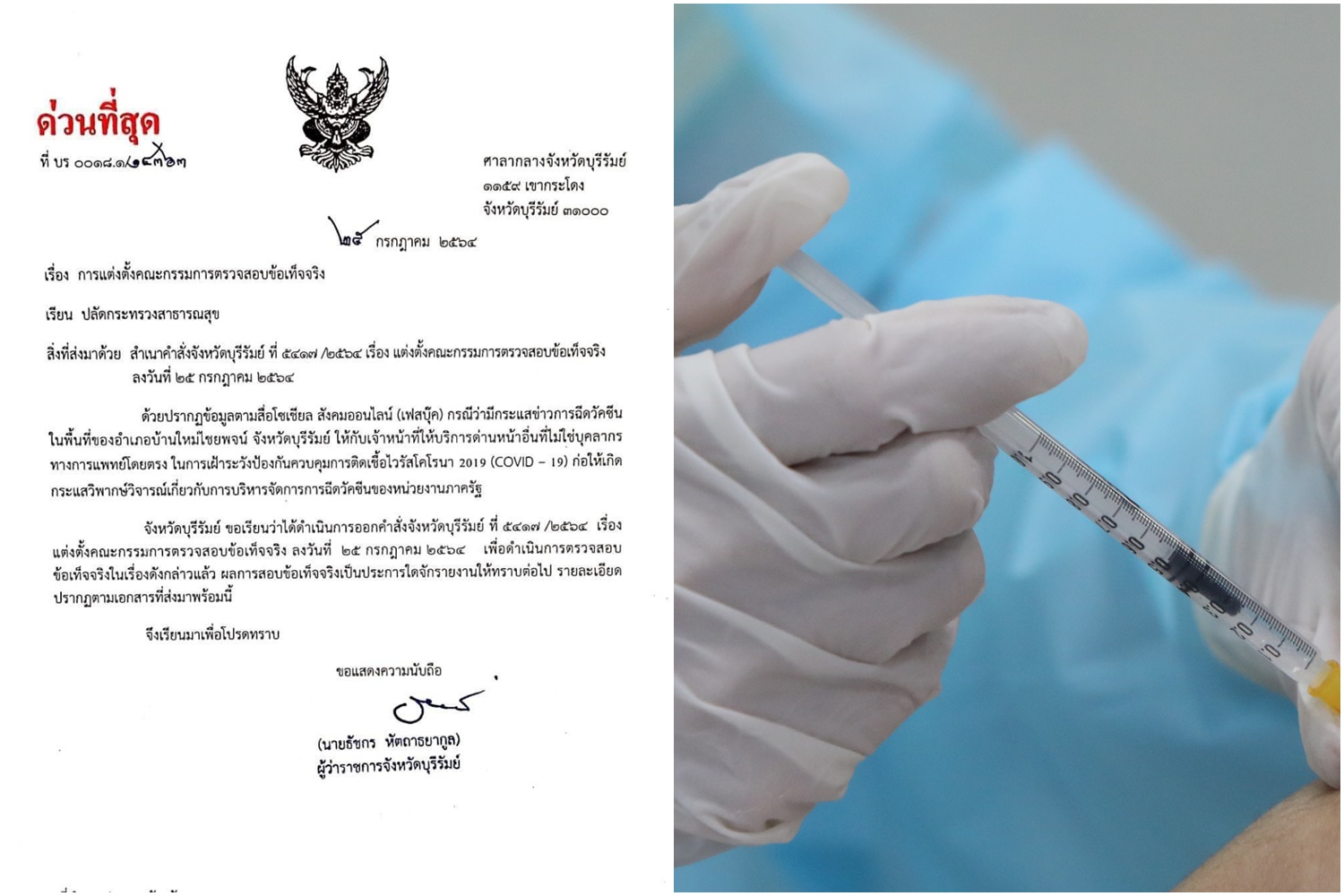ผู้ว่าฯบุรีรัมย์สั่งตั้งกรรมการสอบข้อเท็จจริงประเด็นกระแสข่าวฉีดวัคซีนเข็ม3ให้เจ้าหน้าที่ด่านหน้าที่ไม่ใช่บุคลากรการแพทย์