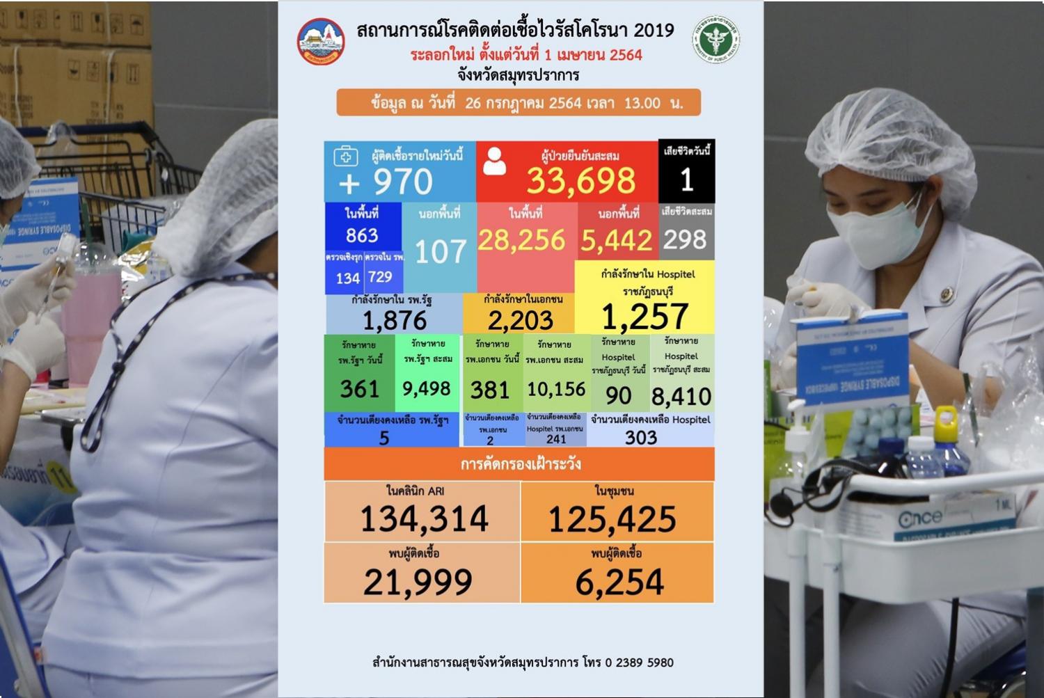 เมื่อวันที่ 26 ก.ค. นพ.พรณรงค์ ศรีม่วง นายแพทย์สาธารณสุขจังหวัดสมุทรปราการ เปิดเผยว่า สถานการณ์ผู้ติดเชื้อไวรัสโควิด-19 ในจังหวัดสมุทรปราการพบผู้ติดเชื้อรายใหม่จำนวน 970 ราย เป็นผู้ป่วยในพื้นที่จำนวน 863 ราย แยกเป็น อำเภอเมืองสมุทรปราการ 431 ราย อำเภอพระประแดง 250 ราย อำเภอพระสมุทรเจดีย์ 33 ราย อำเภอบางพลี 123 ราย อำเภอบางบ่อ 10 ราย อำเภอบางเสาธง 16 ราย