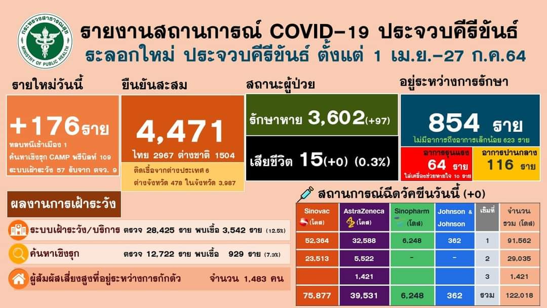 ประจวบคีรีขันธ์-ตรวจเจอติดเชื้อโควิดเพิ่ม 176 ราย เจอจากตรวจค้นหาเชิงรุกในแคมป์คนงานก่อสร้างกลางเมืองหัวหินมากถึง 109 ราย อาการหนัก 64 คนใส่เครื่องช่วยหายใจ 10 คน