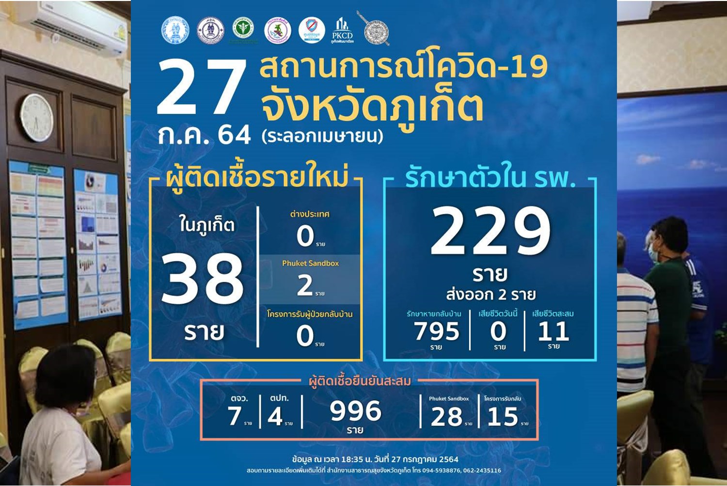 เมื่อวันที่ 27 กรกฎาคม สำนักงานสาธารณสุชจังหวัดภูเก็ต รายงานสถานการณ์การติดเชื้อโควิด-19 จังหวัดภูเก็ตพบผู้ติดเชื้อรายใหม่จากในภูเก็ต 38 ราย ผู้ติดเชื้อรายใหม่จากต่างประเทศ 0 ราย ผู้ติดเชื้อรายใหม่จาก Phuket Sandbox 2 ราย โครงการรับผู้ป่วยกลับบ้าน 0 ราย