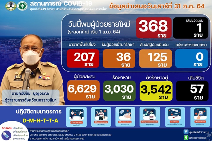 ส่วนสถานการณ์การแพร่ระบาดของโรคติดเชื้อโควิด19 วันนี้ (31 กรกฎาคม 2564) พบผู้ป่วยรายใหม่เพิ่มอีก 368 ราย โดยมาจากพื้นที่เสี่ยง 207 ราย รับผู้ป่วยเข้ามารักษา 36 ราย และสัมผัสผู้ป่วยยืนยัน 125 ราย ซึ่งในยอด 368 รายนี้ เป็นการตรวจพบเชื้อโควิด 19 ในพื้นที่จังหวัด 243 ราย และติดเชื้อมาจากนอกพื้นที่จังหวัด 125 ราย ทำให้ยอดผู้ป่วยสะสม 6,629 ราย ทั้งนี้รักษาหายแล้ว 3,030 ราย ยังรักษาอยู่ 3,542 ราย และเสียชีวิตเพิ่ม 1 ราย ทำให้มียอดเสียชีวิตสะสม 57 รายแล้ว โดยผู้เสียชีวิตรายที่ 57 ของจังหวัด เป็นผู้ป่วยโควิด19 ลำดับที่ 5102 เพศหญิง อายุ 80 ปี ชาว ต.จระเข้หิน อ.ครบุรี มีประวัติสัมผัสผู้ป่วยยืนยันโควิด19 เริ่มมีอาการป่วยและเข้ามารักษาที่ รพ.ครบุรี เมื่อวันที่ 25 กรกฎาคม 2564 และตรวจพบว่าติดเชื้อ วันที่ 28 กรกฎาคม 2564 มีอาการเหนื่อยหอบมากขึ้น จึงส่งรักษาต่อที่ รพ.มหาราชนครราชสีมา จนวันที่ 30 กรกฎาคม 2564 อาการไม่ดีขึ้น และเสียชีวิตลงในเวลา 11.40 น.