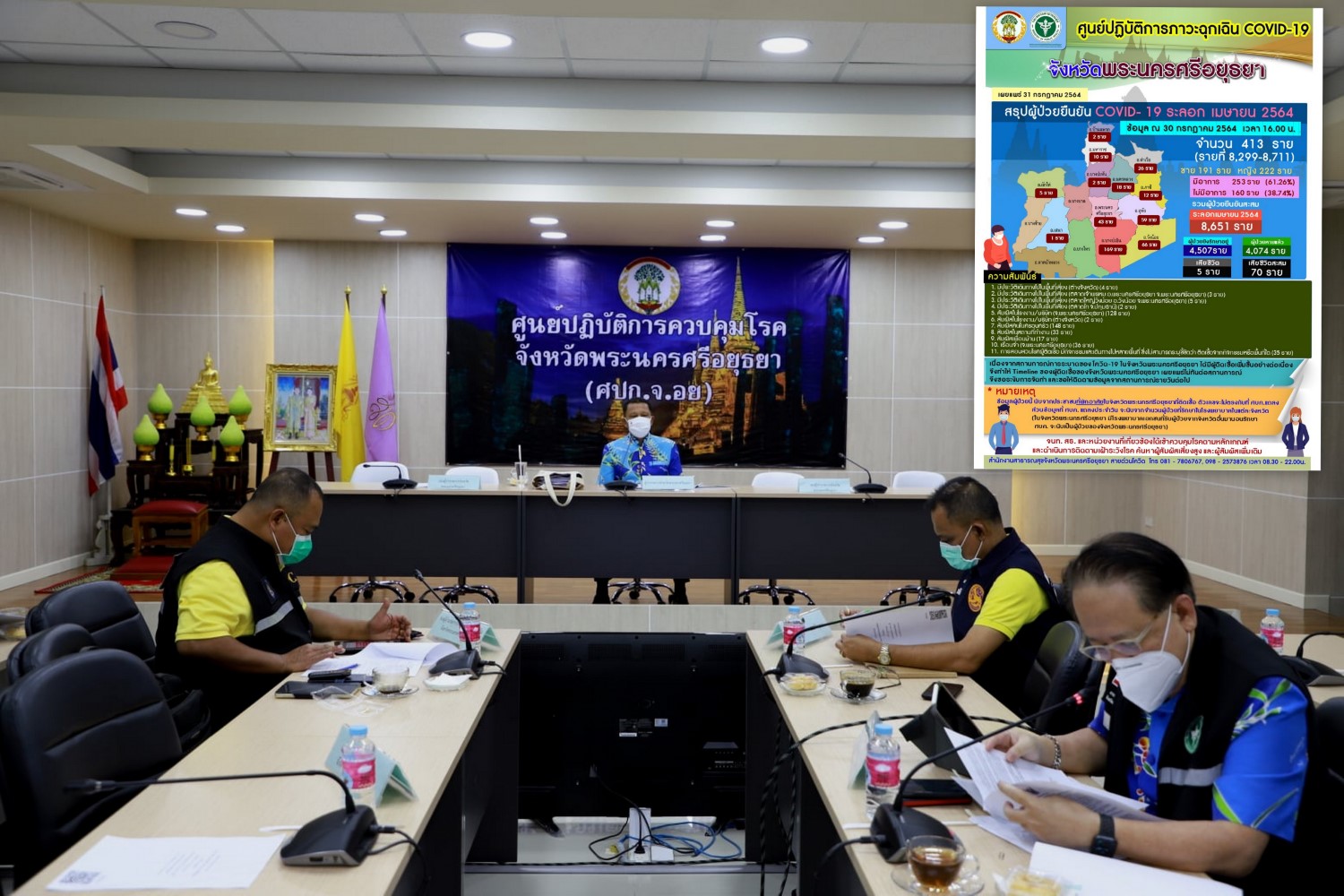 ล่าสุด นายภานุ แย้มศรี ผู้ว่าราชการ จ.พระนครศรีอยุธยา เปิดเผยว่า ได้จัดตั้งเฟชบุ๊ก -แฟนเพจ “ ศูนย์ปฏิบัติการควบคุมโรคอยุธยา ”พร้อมตั้งศูนย์อำนวยการที่ศาลากลางจังหวัด เพื่อเป็นสื่อกลางในการสื่อสารข้อมูลข่าวสารต่าง ๆ และประสานความช่วยเหลือ กับพี่น้องประชาชน ที่กำลังประสบปัญหา การแพร่ระบาดอยู่ในขณะนี้