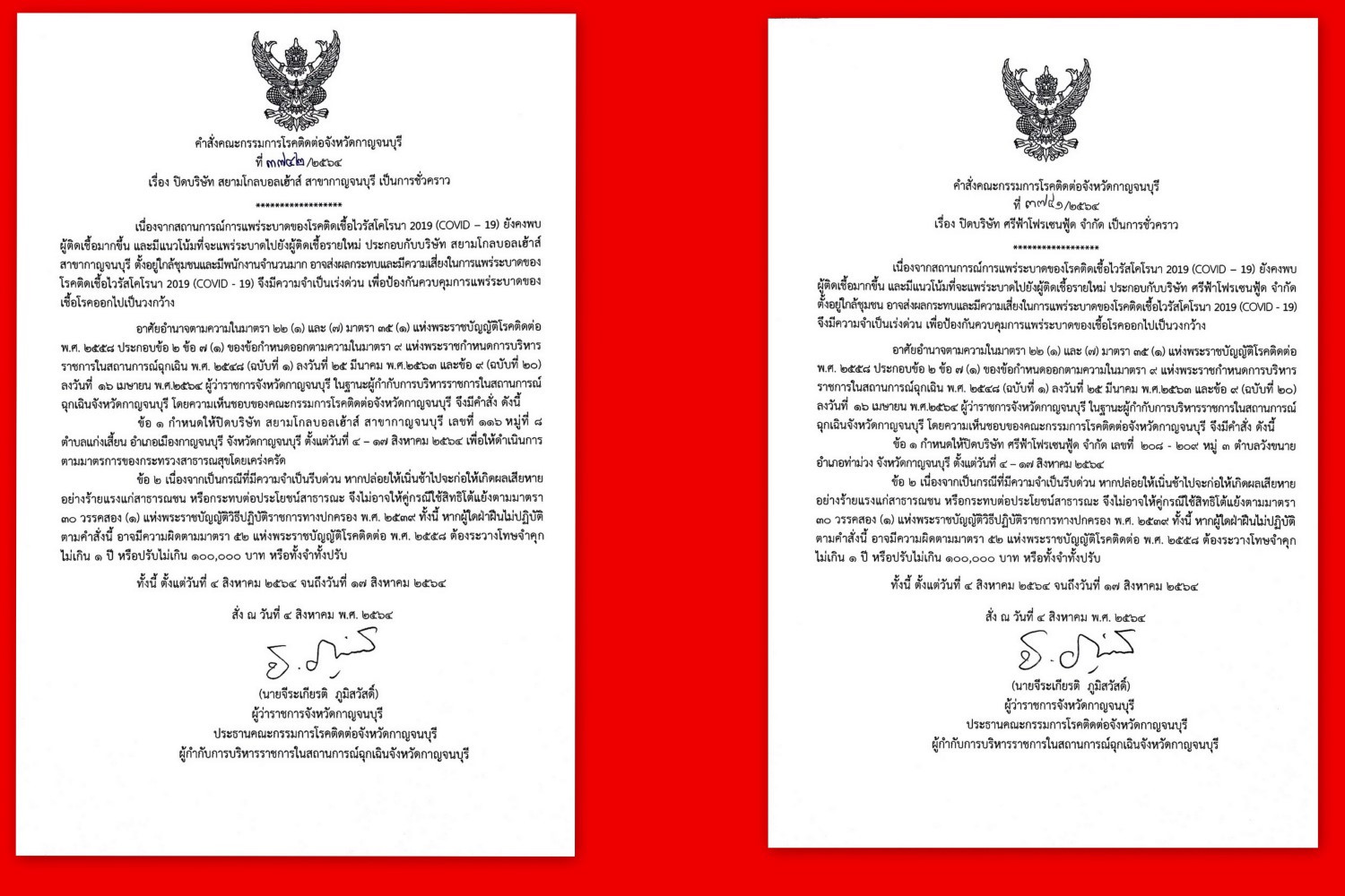 เมื่อวันที่ 4 ส.ค.64 นายจีระเกียรติ ภูมิสวัสดิ์ ผู้ว่าราชการจังหวัดกาญจนบุรี ประธานคณะกรรมการโรคติดต่อจังหวัดกาญจนบุรี ผู้กำกับการบริหารราชการในสถานการณ์ฉุกเฉินจังหวัดกาญจนบุรี ลงนามประกาศคำสั่งคณะกรรมการโรคติดต่อจังหวัดกาญจนบุรี ที่ 3742/2564 เรื่อง ปิดบริษัท สยามโกลบอลเฮ้าส์ สาขากาญจนบุรี เป็นการชั่วคราว