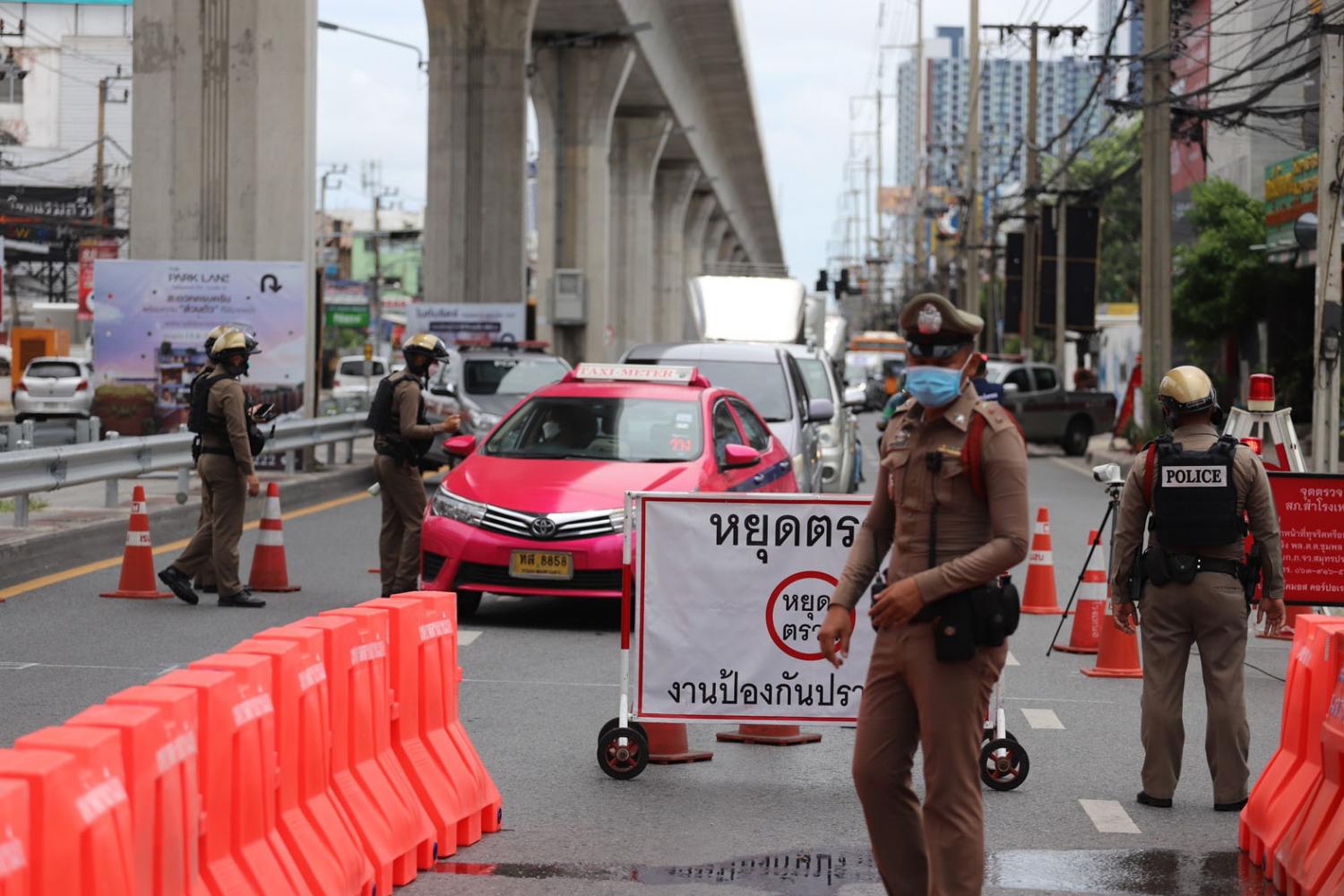 ขณะที่ เจ้าหน้าที่ตำรวจชุดควบคุมฝูงชนของตำรวจภูธรจังหวัดสมุทรปราการ เข้าตรึงกำลังตามจุดต่าง ๆ และเดินลาดตระเวนไปตามถนนสุขุมวิทโดยเฉพาะเส้นทางขาเข้านครบาลซึ่งเป็นพื้นที่ติดต่อกับเขตบางนา ได้มีกำลังเจ้าหน้าที่ตำรวจ สภ.สำโรงเหนือ และเจ้าหน้าที่ตำรวจชุดควบคุมฝูงชนเข้าตั้งด่านตรวจ รถยนต์ทุกชนิดที่มุ่งหน้าเข้ากรุงเทพฯ และมีการติดป้ายประกาศเตือนห้ามมีการชุมนุม ในพื้นที่จังหวัดสมุทรปราการ ทำให้การจราจรบนถนนสุขุมวิทขาเข้านครบาลบริเวณดังกล่าวเกิดการติดขัดเป็นทางยาวหลายกิโล