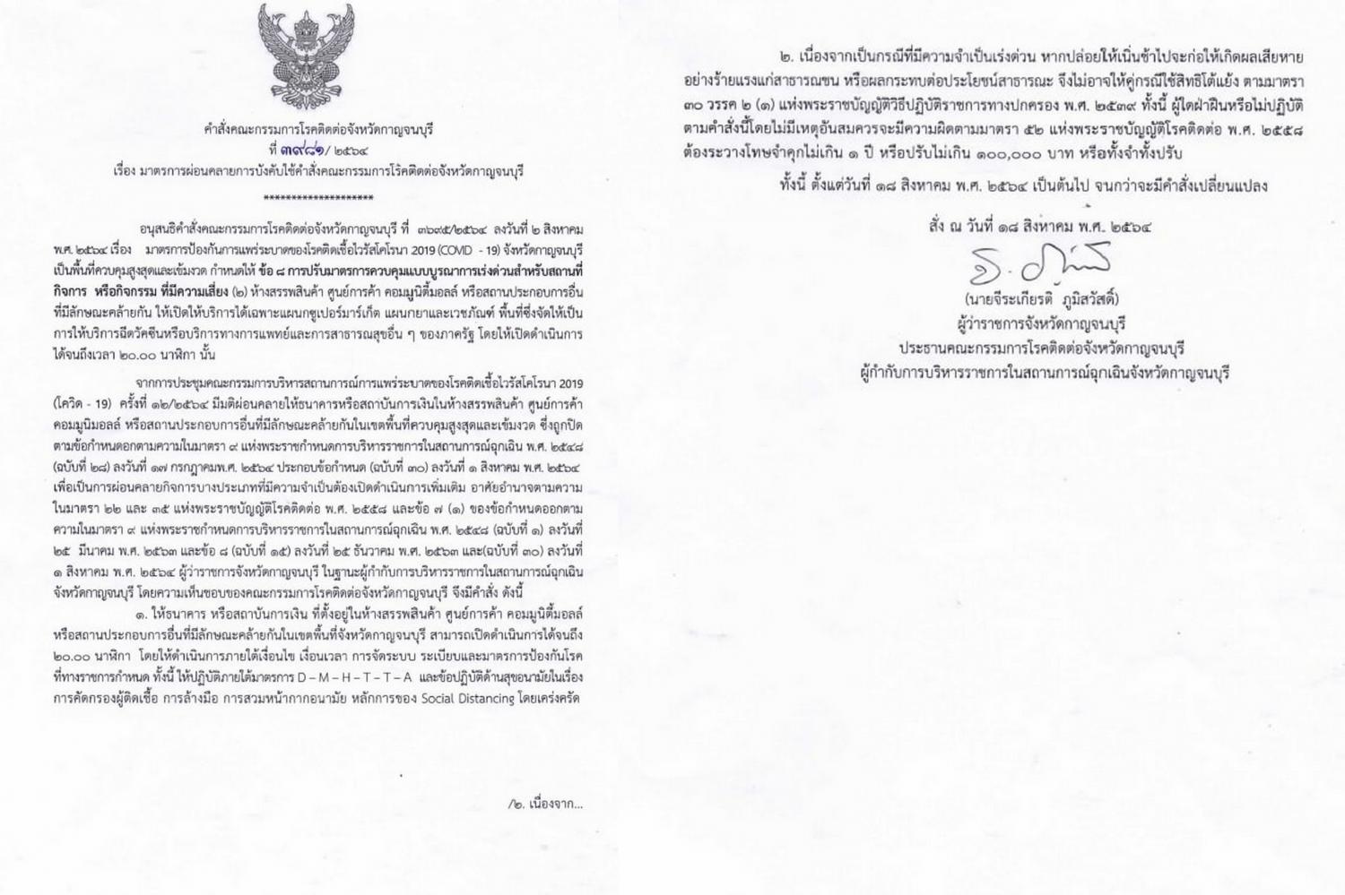 ทั้งนี้ หากผู้ใดฝ่าฝืนหรือไม่ปฏิบัติตามคำสั่งนี้โดยไม่มีเหตุอันสมควรจะมีความผิดตามมาตรา 52 แห่งพระราชบัญญัติโรคติดต่อ พ.ศ. 2558 ต้องระวางโทษจำคุกไม่เกิน 1 ปี หรือปรับไม่เกิน 100,000 บาท หรือทั้งจำทั้งปรับ ทั้งนี้ ตั้งแต่วันที่ 18 สิงหาคม พ.ศ.2564 เป็นต้นไป จนกว่าจะมีคำสั่งเปลี่ยนแปลง สั่ง ณ วันที่ 18 สิงหาคม พ.ศ.2564