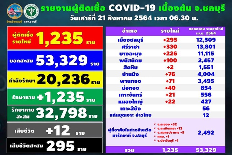 เมื่อวันที่ 20 ส.ค. 64 สำนักงานสาธารณสุขจังหวัดชลบุรี รายงานว่า วันนี้มีผู้ติดเชื้อโควิด-19 รายใหม่ จำนวน1,235 ราย เสียชีวิต 12 ราย รวม 295 ราย