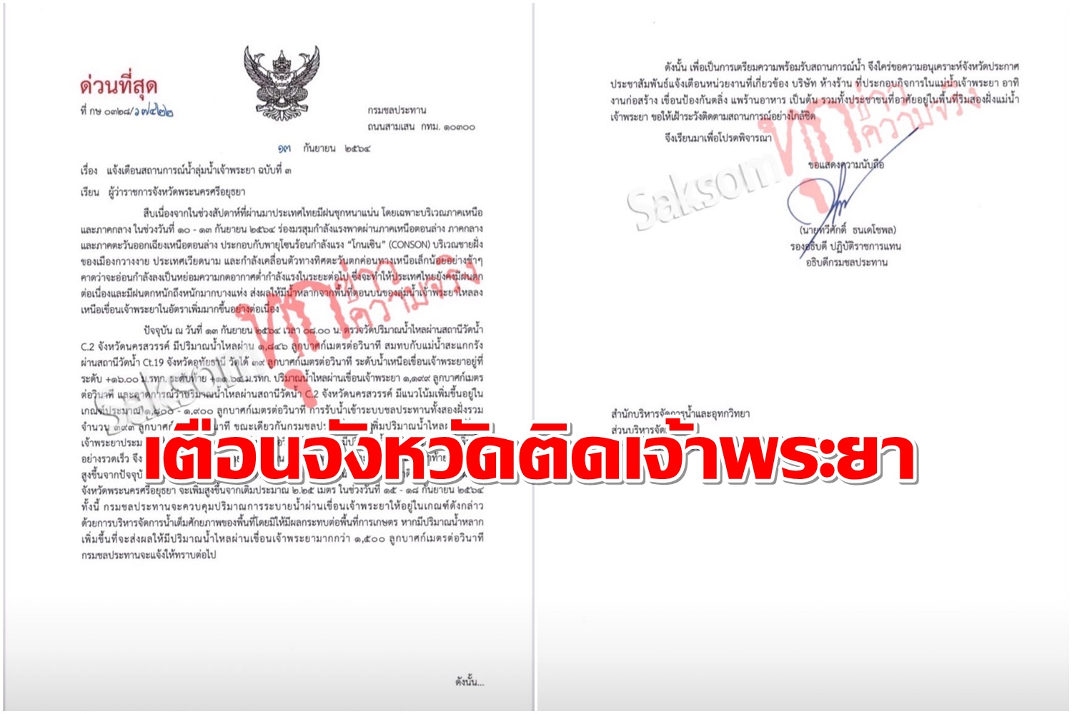 พระนครศรีอยุธยา-กรมชลประทานส่งหนังสือด่วนถึงผู้ว่าฯหลายจังหวัดภาคกลางแจ้งเตือนสถานการณ์น้ำลุ่มน้ำเจ้าพระยาฉบับที่ 3 ให้ระวังน้ำเหนือมาแล้วมีแนวโน้มต้องระบายน้ำสูงถึง 1,500 ลบ.ม./วินาทีจะส่งผลกระทบพื้นที่ท้ายเขื่อน