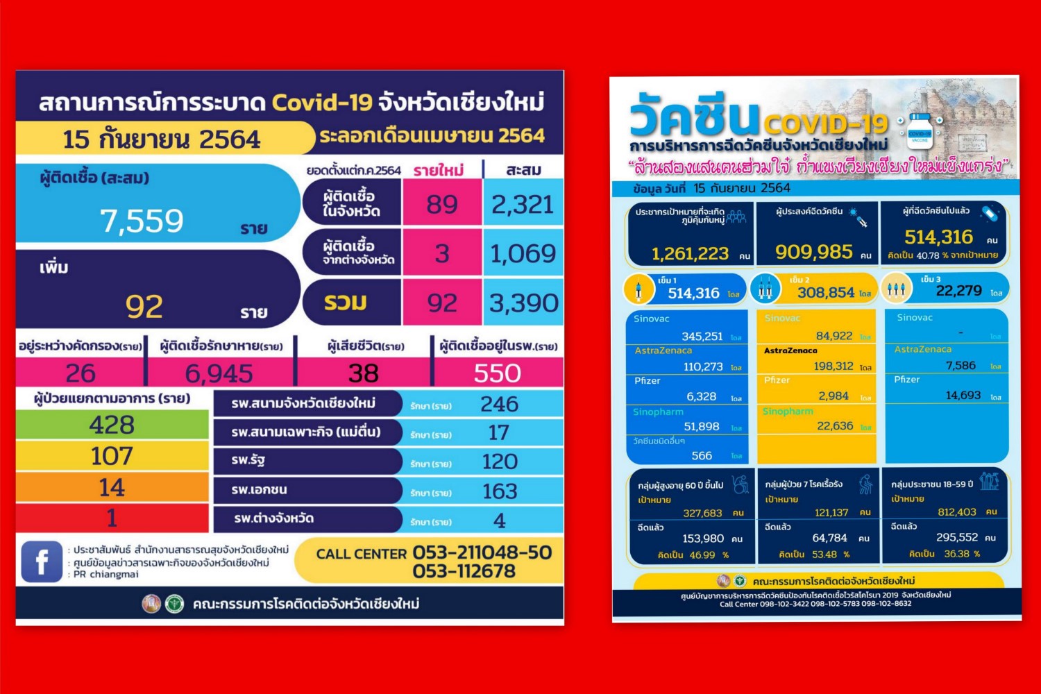 สถานการณ์การแพร่ระบาดโรคโควิด-19 จังหวัดเชียงใหม่วันนี้ กลับมาพบผู้ติดเชื้อโควิด-19 รายใหม่เพิ่มอีก 92 ราย เป็นการติดเชื้อในจังหวัดถึง 89 ราย ผู้ติดเชื้อจากต่างจังหวัด 3 ราย ทำให้ผู้ติดเชื้อสะสมเฉพาะตั้งแต่เดือนกรกฎาคม 2564 อยู่ที่ 3,390 ราย ยังคงรักษาตัวอยู่ในโรงพยาบาลทุกประเภท 550 ราย แยกเป็นโรงพยาบาลสนามจังหวัดเชียงใหม่ 246 ราย โรงพยาบาลสนามเฉพาะกิจ (แม่ตื่น) 17 ราย โรงพยาบาลรัฐ 120 ราย โรงพยาบาลเอกชน 163 ราย และโรงพยาบาลต่างจังหวัดอีก 4 ราย