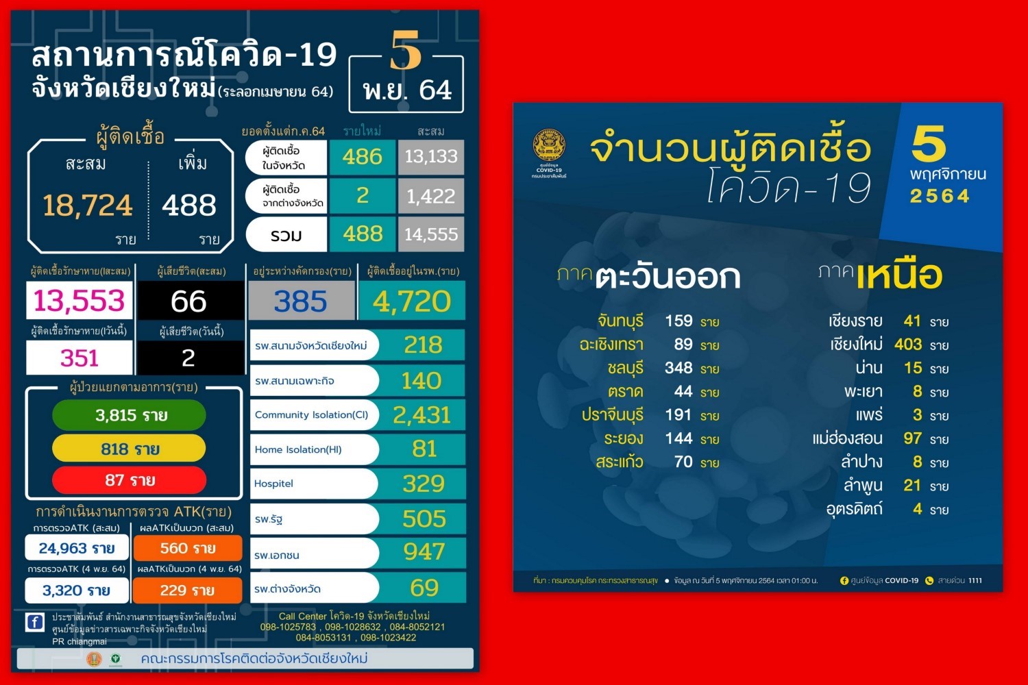เมื่อวันที่ 5พ.ย.64 คณะกรรมการโรคติดต่อจังวัดเชียงใหม่ รายงานว่า วันนี้ พบผู้ติดเชื้อโควิด-19 รายใหม่ เพิ่มอีก 448 ราย มีผู้ป่วยสะสมตั้งแต่เมษายนจำนวน 18,724 ราย รักษาหายแล้ว 351 ราย ยอดรวม 13,559 ราย มีผู้เสียชีวิตเพิ่มมาอีก 2 ราย ยอดสะสม 66 ราย