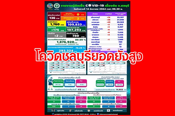 เมื่อวันที่ 14 ธ.ค. 64 สำนักงานสาธารณสุขจังหวัดชลบุรี รายงานว่า วันนี้มีผู้ติดเชื้อโควิด-19 รายใหม่ จำนวน 136 ราย เสียชีวิต 2 ราย รวม 780 ราย