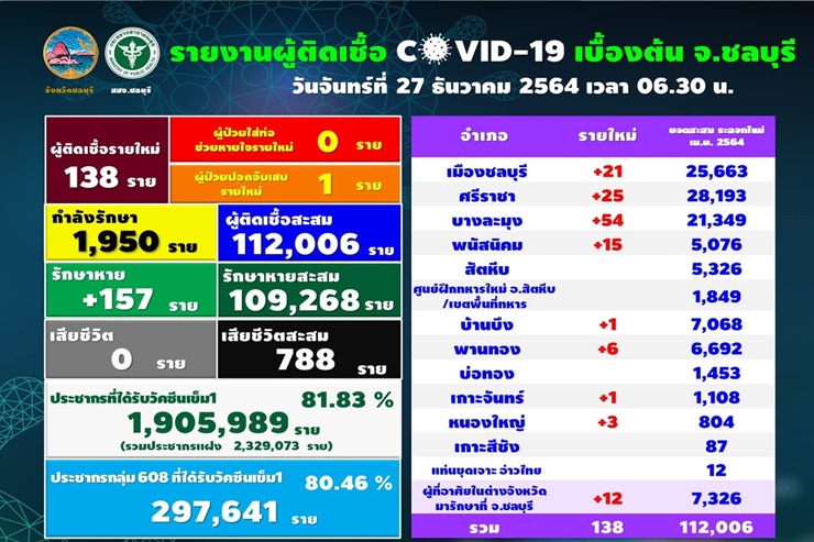 เมื่อวันที่ 27 ธ.ค. 64 สำนักงานสาธารณสุขจังหวัดชลบุรี รายงานว่า วันนี้มีผู้ติดเชื้อโควิด-19 รายใหม่ จำนวน 138 ราย