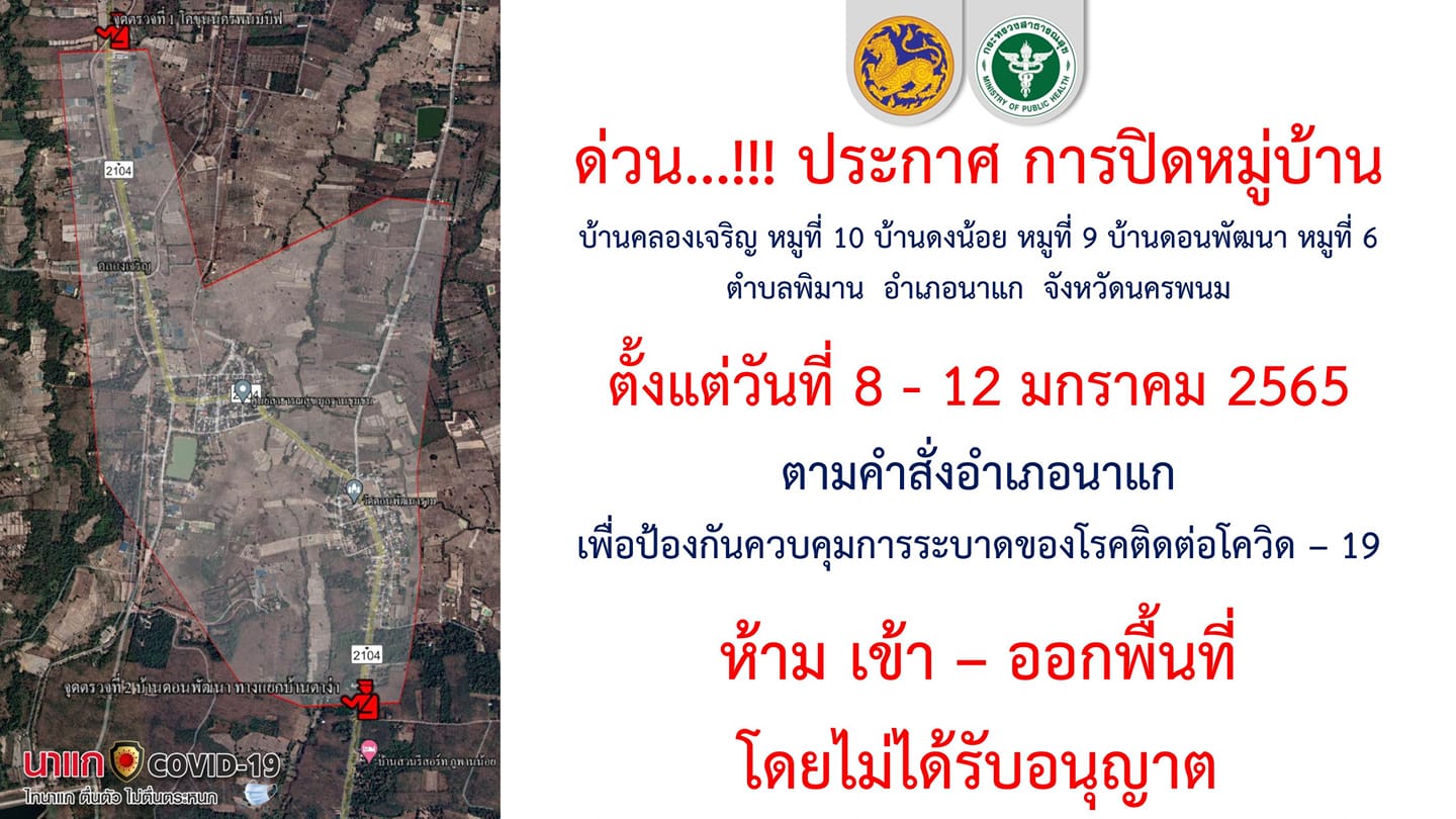 ขณะเดียวกัน สำนักงานสาธารณสุขจังหวัดนครพนม พร้อมด้วยคณะกรรมการโรคติดต่อ อ.นาแก อบต.พิมาน และเจ้าหน้าที่เกี่ยวข้อง ได้มีคำสั่งประกาศปิดพื้นที่ 3 หมู่บ้าน ปะกอบด้วย บ้านดอนพัฒนาหมู่ 6 บ้านดงน้อยหมู่ 9 และ บ้านคลองเจริญหมู่ 10 ต.พิมาน อ.นาแก หลังพบคลัสเตอร์หมอลำ เนื่องจากมีกลุ่มเสี่ยงไปร่วมงานหมอลำในพื้นที่เขตติดต่อ อ.ดงหลวง จ.มุกดาหาร ทำให้มีผู้ป่วยติดเชื้อ แล้วกว่า 60 ราย มีผู้ป่วยเสี่ยงสูงรอยืนยันผลตรวจกว่า 200 ราย จึงต้องปิดพื้นที่ 3 หมู่บ้าน ล็อกดาวน์ ตั้งแต่วันที่ 8 -12 ม.ค.2565 ห้ามเข้าออกโดยไม่ได้รับอนุญาต เพื่อตรวจสอบคัดกรองหาผู้ป่วย ป้องกันการแพร่ระบาด