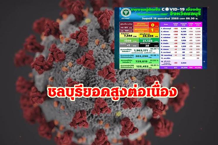 เมื่อวันที่ 18ก.พ. 65 สำนักงานสาธารณสุขจังหวัดชลบุรี รายงานว่า วันนี้มีผู้ติดเชื้อโควิด-19 รายใหม่ จำนวน 811 ราย ผล ATK 709 ราย เสียชีวิต 1 ราย รวม 38 ราย (ยอดสะสมตั้งแต่ 1 มค. 65 )