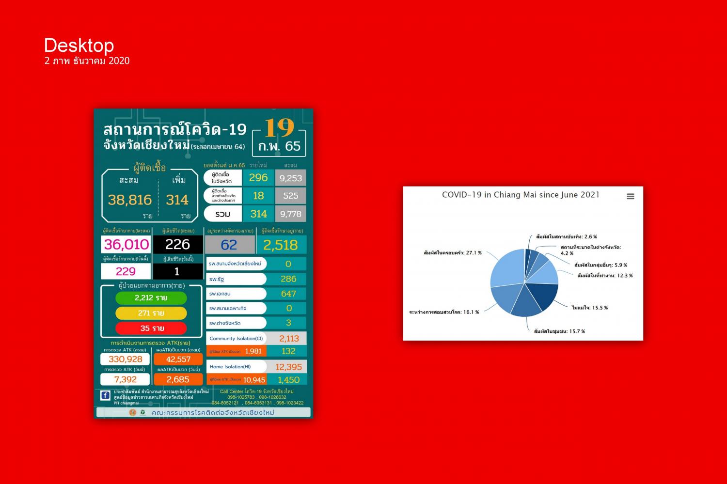 นายวรวิทย์ ชัยสวัสดิ์ รองผู้ว่าราชการเชียงใหม่ เปิดเผยว่า สถานการณ์โควิด-19 ระบาดในพื้นที่วันนี้ (19ก.พ.65) พบผู้ติดเชื้อรายใหม่ ตามผล RT-PCR เพิ่มสูง 314 ราย เกิน 90% เป็นผู้ติดเชื้อภายในจังหวัดทั้งคลัสเตอร์เดิมและคลัสเตอร์ใหม่ นอกจากนี้ยังมีผู้ติดเชื้อจากการตรวจ ATK 7,392 รายพบติดเชื้อเพิ่มสูงมาอีกถึง 2,685 ราย หรือนิวไฮครั้งใหม่ รวมยอดติดเชื้อวันนี้ 2,999 ราย เสียชีวิตเพิ่มมาอีก 1 รายรวมสะสมแล้ว 226 ราย