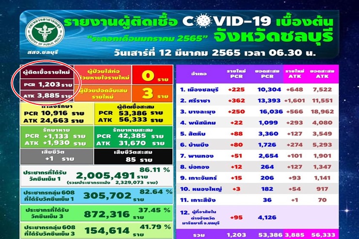 เมื่อวันที่ 12 มี.ค. 65 สำนักงานสาธารณสุขจังหวัดชลบุรี รายงานว่า วันนี้มีผู้ติดเชื้อโควิด-19 รายใหม่ จากผล RT-PCR จำนวน 1,203 ราย ATK 3,885 ราย เสียชีวิต 1 ราย รวม 85 ราย (ยอดสะสมตั้งแต่ 1 ม.ค. 65 )