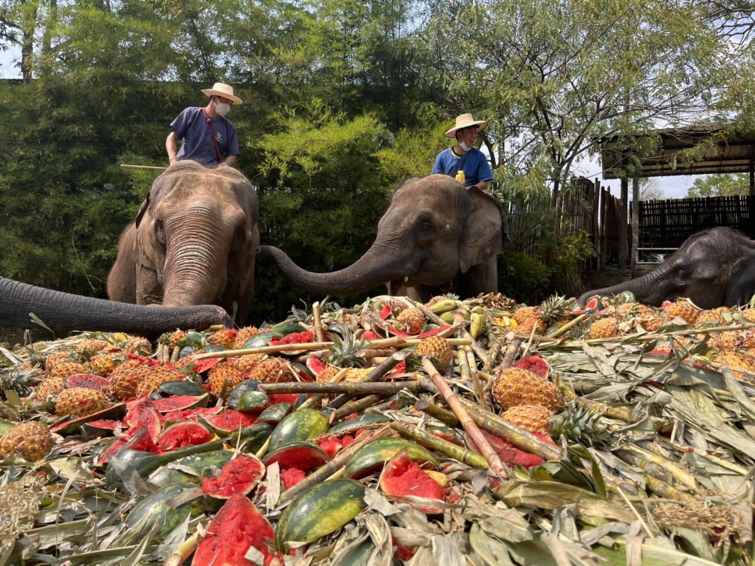 ทั้งนี้ ในช่วงเช้ามีพิธีสงฆ์ประพรมน้ำมนต์ให้กับช้างในปางช้างแม่แตง และในช่วงบ่ายได้มีการจัดเลี้ยงบุฟเฟต์ผลไม้ในรูปแบบขันโตกยักษ์ ซึ่งประกอบด้วยต้นข้าวโพด กล้วย อ้อย ฟักทอง สับปะรด และแตงโม โดยได้รับการสนับสนุนจากโครงการคนช่วยช้างช้างช่วยคน โดย นายวีรเวช ศุภวัฒน์ แห่งบริษัทกุ๊บไตจำกัด จ.แม่ฮ่องสอน , สมาคมสหพันธ์ช้างไทย อาจารย์บอย บารมีเทพบันดาล แม่พลอย ร้อยล้าน พร้อมคณะศิษย์แม่หมวย พันล้าน Brand Drich VALUE พร้อมคณะลูกทีม ร่วมกันเป็นเจ้าภาพจัดเลี้ยงขันโตกบุฟเฟต์ผลไม้เลี้ยงช้างในครั้งนี้