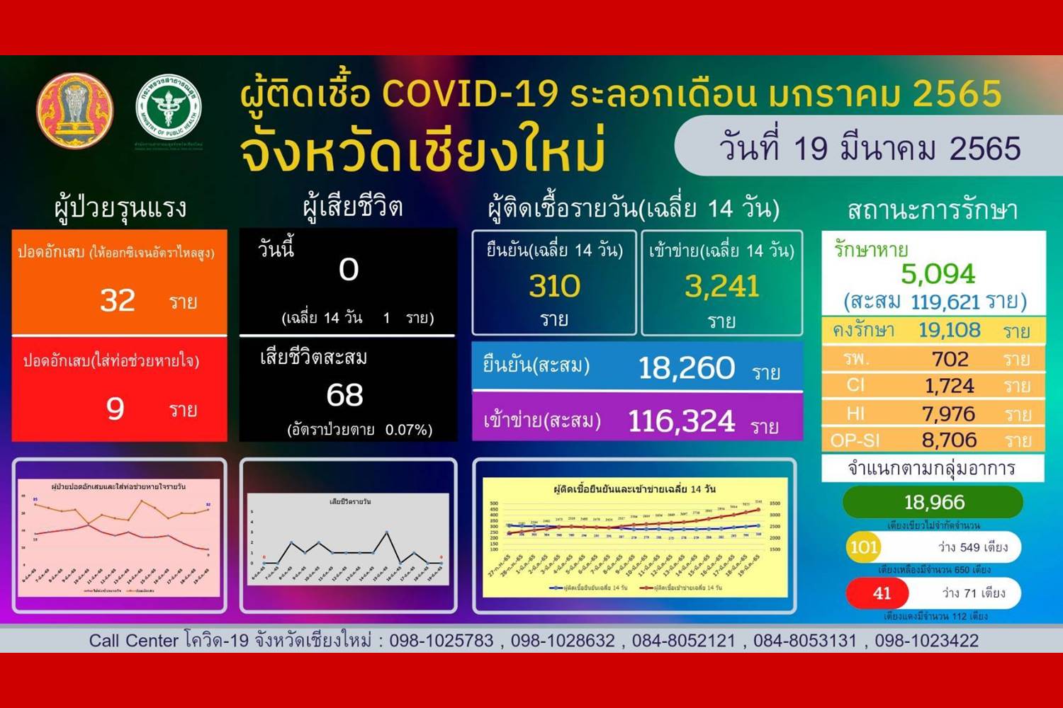 ศูนย์ข้อมูลข่าวสารเฉพาะกิจของจังหวัดเชียงใหม่ รายงานสถานการณ์โควิด-19 ประจำวันนี้(19มี.ค.65) ว่า สถานการณ์การระบาดยังพบการติดเชื้อรายใหม่เพิ่มสูงเป็นสถิติอีกรอบที่ 3,551 ราย(RT-PCR=310, ATK=3,241) คงค้างรักษาตัวในทุกระบบเพิ่มขึ้นเป็น 19,108 ราย จำนวนนี้อาการหนัก 41ราย