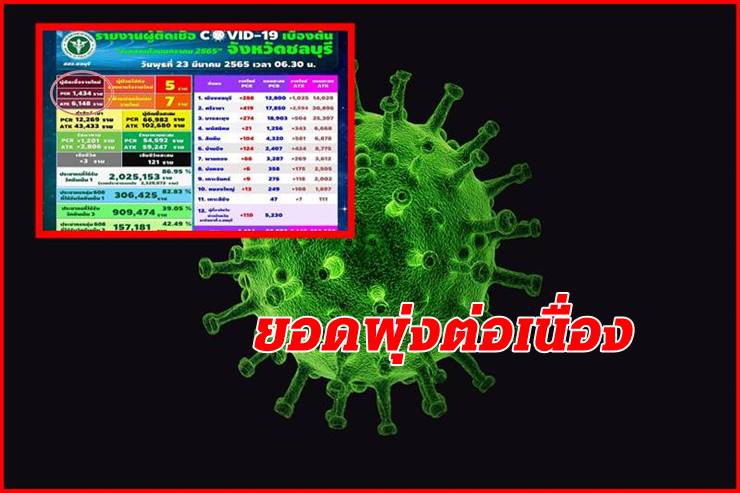 เมื่อวันที่ 23 มี.ค. 65 สำนักงานสาธารณสุขจังหวัดชลบุรี รายงานว่า วันนี้มีผู้ติดเชื้อโควิด-19 รายใหม่ จากผล RT-PCR จำนวน 1,434 ราย ATK 6,148 ราย เสียชีวิต 3 ราย รวม 121 ราย (ยอดสะสมตั้งแต่ 1 ม.ค. 65 )