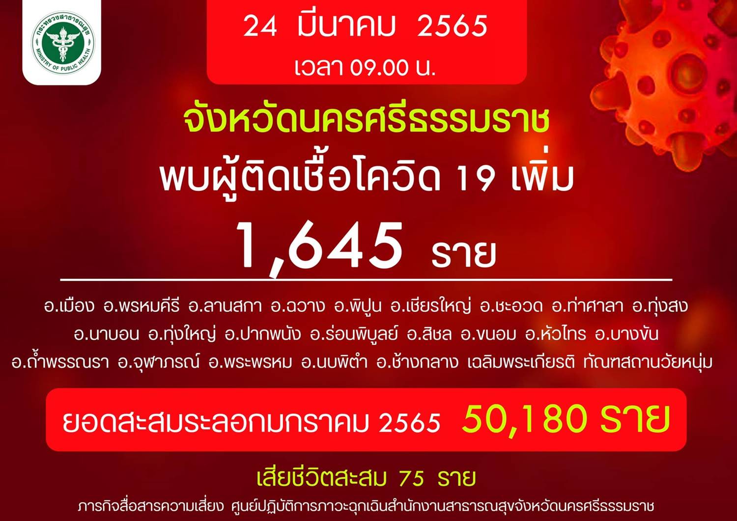 เมื่อวันที่ 24 มีนาคม 2565 สำนักงานสาธารณสุขจังหวัดนครศรีธรรมราช รายงานสถานการณ์โควิด-19 พบผู้ป่วยโควิด-19 เพิ่ม 1,645 ราย ยอดผู้ป่วยสะสม 50,180 ราย เสียชีวิตสะสม 75 ราย