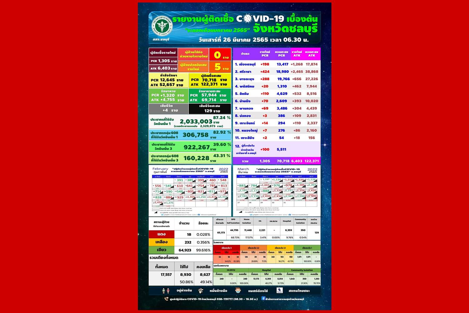 สำนักงานสาธารณสุขจังหวัดชลบุรี สสจ.ชลบุรี รายงานผู้ติดเชื้อโควิด-19 รายใหม่ จำนวน 1,305 ราย (ผู้ติดเชื้อยืนยัน RT-PCR)