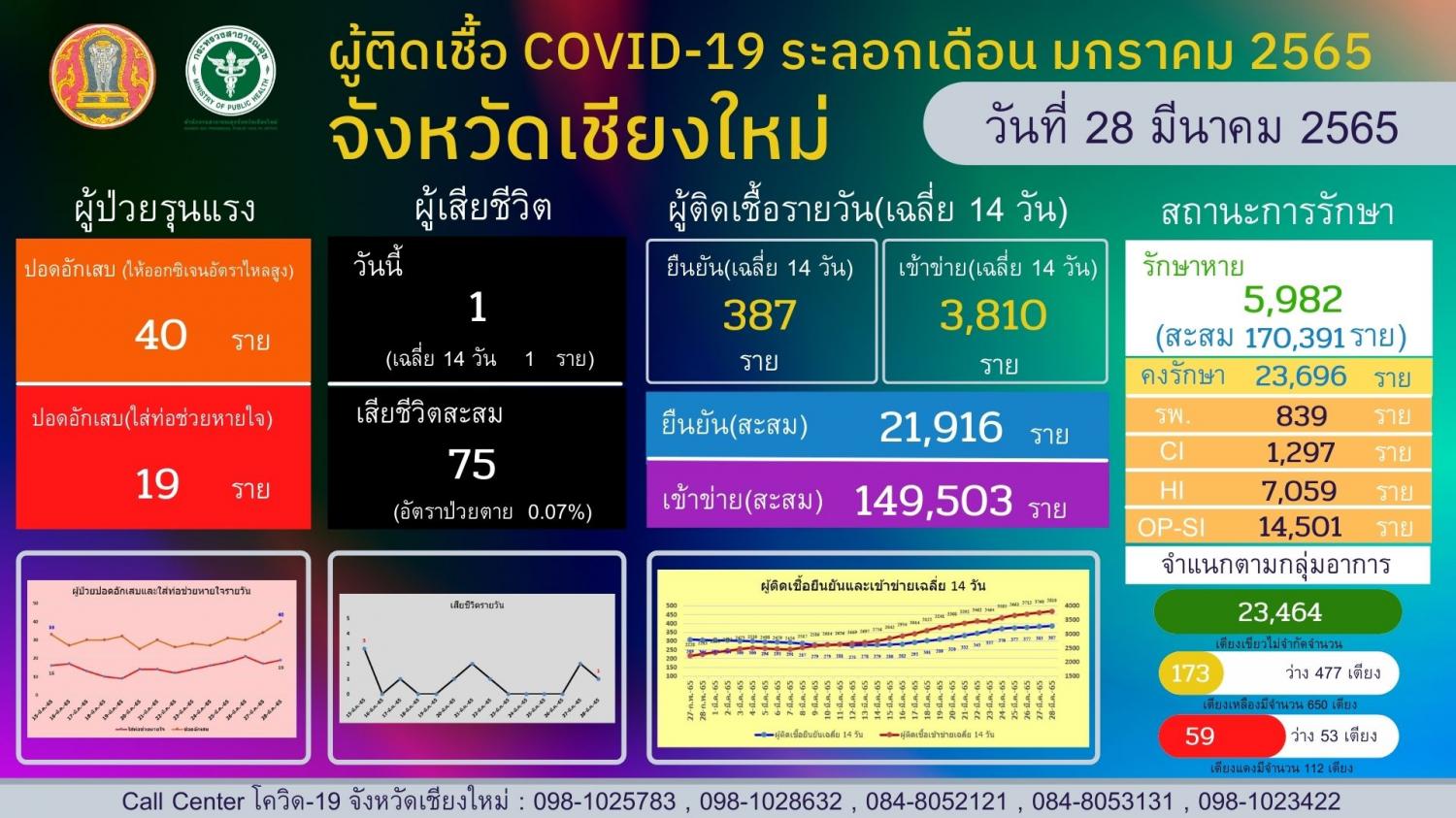 เมื่อวันที่ 28 มี.ค. ศูนย์ข้อมูลข่าวสารเฉพาะกิจของจังหวัดเชียงใหม่ เปิดเผยสถานการณ์โควิด-19 ประจำวันว่า วัพบผู้ติดเชื้อยืนยันรายใหม่จากการตรวจแบบ (RT-PCR)เพิ่ม 387 ราย เข้าข่าย (ATK) 3,810 ราย ยอดรวม 4,197 ราย เป็นสถิติยอดสูงที่สุดตั้งแต่มีการระบาด โดยมีเสียชีวิตเพิ่ม 1 ราย รวมระลอกนี้เสียชีวิตแล้ว 75 ราย
