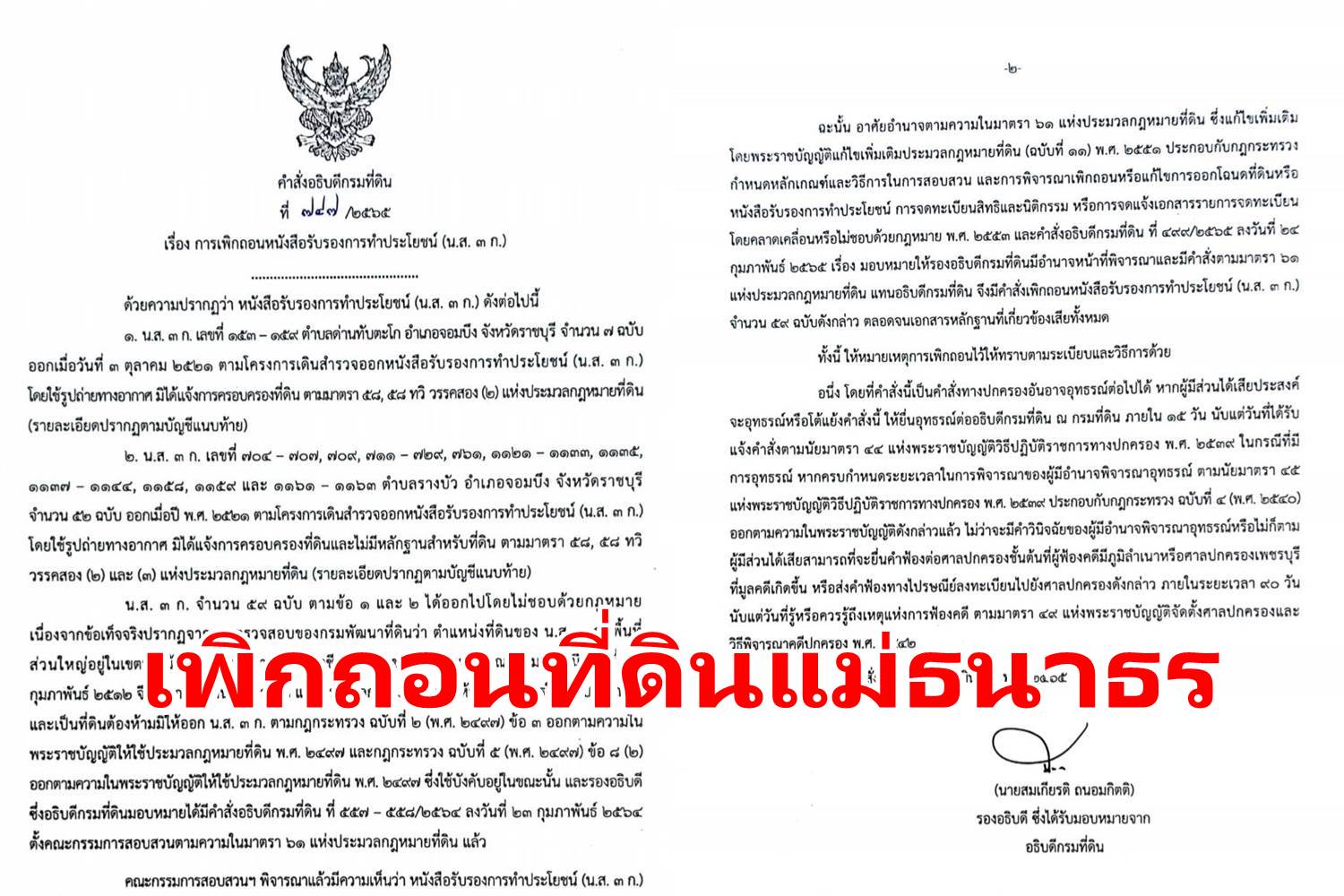 เมื่อวันที่ 29 มีนาคม กรมที่ดินได้มีคำสั่งเพิกถอนหนังสือรับรองการทำประโยชน์ (น.ส.3 ก.) ในท้องที่ตำบลด่านทับตะโก ตำบลรางบัว อำเภอจอมบึง จังหวัดราชบุรี จำนวน 59 ฉบับ เนื้อที่รวม 2,111-1-69 ไร่ ที่ได้ออกเมื่อปี พ.ศ. 2521 ตามโครงการเดินสำรวจออกหนังสือรับรองการทำประโยชน์ (น.ส.3 ก.) โดยใช้ระวางรูปถ่ายทางอากาศมิได้แจ้งการครอบครองที่ดิน โดยบริเวณที่ดินดังกล่าวตั้งอยู่ในเขตป่าไม้ถาวร "ป่าฝั่งซ้ายแม่น้ำภาซี (หมายเลข 85)" ซึ่งต่อมาได้ประกาศเป็นเขตป่าสงวนแห่งชาติ "ป่าฝั่งซ้ายแม่น้ำชี" เมื่อปี พ.ศ.2527 จึงเป็นการผ่าฝืนมาตรา 58 แห่งประมวลกฎหมายที่ดิน ที่ห้ามดำเนินการในเขตป่าไม้ถาวร และเป็นที่ดินต้องห้ามมิให้ออก น.ส.3 ก.ตามกฎกระทรวง ฉบับที่ 2 (พ.ศ. 2499) ข้อ 3 ซึ่งบังคับอยู่ในขณะนั้น คณะกรรมการสอบสวนเห็นว่า น.ส. 3 ก. ดังกล่าวออกไปโดยไม่ชอบด้วยกฎหมาย สมควรเพิกถอน น.ส. 3 ก. ทั้ง 59 ฉบับ กรมที่ดินจึงได้มีคำสั่งอธิบดีกรมที่ดินที่ 747/2565 ลงวันที่ 29 มีนาคม 2565 เพิกถอน น.ส. 3 ก. ดังกล่าวทั้ง 59 ฉบับ