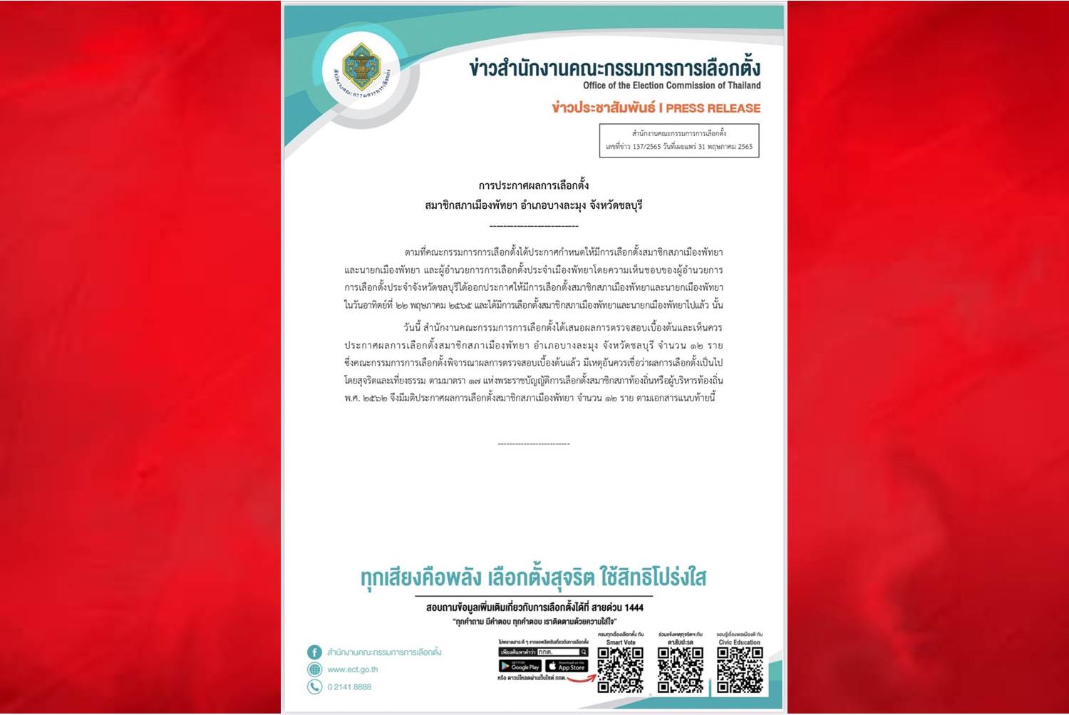 เมื่อวันที่ 31 พ.ค.สำนักงานคณะกรรมการการเลือกตั้งประจำจังหวัดชลบุรี ได้ออกหนังสือประกาศ เรื่องการจัดทำประกาศผลการนับคะแนนเลือกตั้งสมาชิกสภาเมืองพัทยา โดยได้มีมติไม่สั่งให้มีการออกเสียงลงคะแนนสมาชิกสภาเมืองพัทยาใหม่ ในเขตเลือกตั้งที่ 2 หน่วยเลือกตั้งที่ 29 และเขตเลือกตั้งที่ 3 หน่วยเลือกตั้งที่ 4 ดังนั้น เพื่อให้ไปตามข้อ 177 วรรคหนึ่ง ของระเบียบคณะกรรมการ การเลือกตั้งว่าด้วยการเลือกตั้งสมาชิกสภาท้องถิ่นหรือผู้บริหารท้องถิ่น พ.ศ.2562 แก้ไขเพิ่มเติมถึง (ฉบับที่ 3 ) พ.ศ.2564 จึงขอให้คณะกรรมการการเลือกตั้งประจำเมืองพัทยาดำเนินการจัดทำประกาศผลการนับคะแนน เลือกตั้งสมาชิกสภาเมืองพัทยา ของเขตเลือกตั้งที่ 2 และเขตเลือกตั้งที่ 3 แล้วส่งสำนักงานคณะกรรมการการเลือกตั้งประจำจังหวัดชลบุรี (ฉบับจริง) จำนวน 2 ชุด เพื่อเสนอคณะกรรมการการเลือกตั้งพิจารณาประกาศผลการเลือกตั้งต่อไป