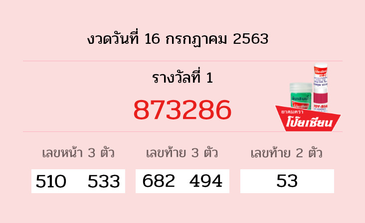 ตรวจผลออกรางวัลสลากกินแบ่งรัฐบาลงวดวันที่ 16ก.ค.63 รางวัลที่1 คือ 873286 เลขหน้า3ตัว 510/533 เลข3ตัวท้าย 682/494 เลขท้าย2ตัว 53