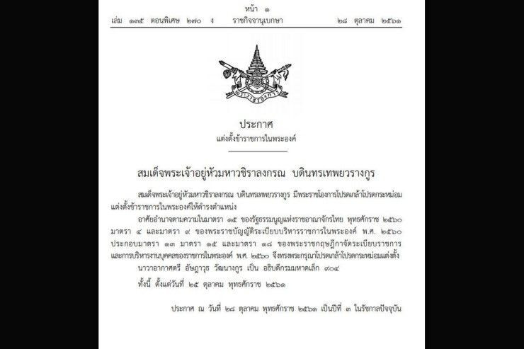 ราชกิจจาฯ เผยแพร่พระราชโองการโปรดเกล้าแต่งตั้ง นาวาอากาศตรี อัษฎาวุธ วัฒนางกูร เป็นอธิบดีกรมมหาดเล็ก 904