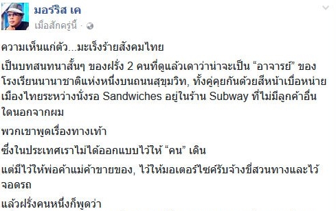 เป็นบทสนทนาสั้นๆ ของฝรั่ง 2 คนที่ดูแล้วเดาว่าน่าจะเป็น “อาจารย์” ของโรงเรียนนานาชาติแห่งหนึ่งบนถนนสุขุมวิท, ทั้งคู่คุยกันด้วยสีหน้าเบื่อหน่ายเมืองไทยระหว่างนั่งรอ Sandwiches อยู่ในร้าน Subway ที่ไม่มีลูกค้าอื่นใดนอกจากผม