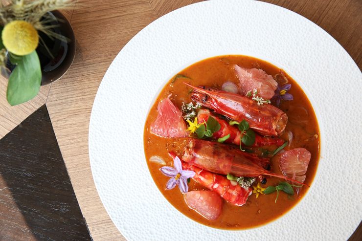"อย่างน้ำซอสของยำส้มโอเป็นสูตรเก่าเลยที่ใหม่คือ การพรีเซนต์อาหาร ถ้าดูอย่างเดียวคนก็อาจจะบอกว่า มันไม่ใช่ยำส้มโอหรอก แต่พอชิมแล้วก็จะรู้ว่านี่เป็นยำส้มโอ แทนที่เราจะทำส้มโอให้เป็นเกล็ดๆ แล้วก็เอากุ้งไปรวมกัน เราก็แยกออกมาซะ ข้างล่างจานนี้ก็ยังมีใบชะพลูอยู่เพิ่มความหอม แต่เราไม่ได้พรีเซนต์ให้เด่น มะพร้าวคั่ว หอมเจียวก็ยังอยู่"