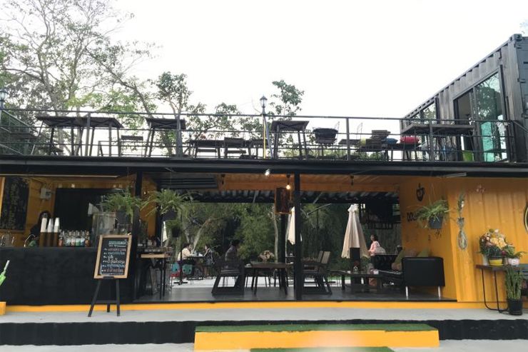 หากจะกล่าวถึงเอกลักษณ์ของทางร้านอีกอย่างหนึ่ง คงหนี้ไม่พ้นรูปแบบการก่อสร้างที่สร้างขึ้นมาจากตู้คอนเทนเนอร์สีเหลืองตัดดำได้อย่างลงตัว ตกแต่งอย่างเท่ๆ แลดูสวยงาม ประกอบด้วยเฟอร์นิเจอร์ไม้ที่เข้ากันกับร้านเป็นอย่างดี แถมห้อมล้อมไปด้วยธรรมชาติของแม่น้ำเพชร ที่หาไม่ได้จากเมืองหลวง