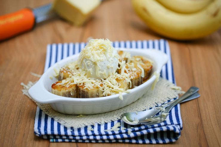 สำหรับชีสที่ใช้เป็นชีสเชดดาร์แบบ Processed มาแล้ว ราคาย่อมเยา แต่เหมาะกับเมนูนี้ที่สุดเพราะกลิ่นชีสไม่รุนแรงจนเกินไป เนื้อสัมผัสนุ่มหยุ่นๆ ละลายได้ง่าย เข้ากับรสหวานก็ได้เค็มก็ดีเข้ากับทั้งกล้วยและไอศกรีมของเรา รสชาติเหมาะกับเด็กและผู้ใหญ่