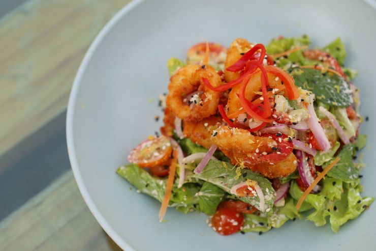 ใครชอบปลาหมึกชุบแป้งทอดก็ลองสั่งมากรอบๆ หนึบๆ มาปรุงเป็นสลัดกับผักนานา เมนูเด็ดเผ็ดร้อนถูกลิ้นไทยๆ ก็มีอย่าง ผัดกะเพราเนื้อวากิว ซึ่งเลือกใช้เนื้อวัววากิวชั้นดีจากออสเตรเลีย นำมาผัดหอมกรุ่นด้วยสมุนไพรไทย และของหวานก็ไม่ขาดตกบกพร่อง จานที่เรียกว่า ช็อกโกแลต พัฟโลวา ตัวขนมคล้ายเมอแรงต์แต่งรสช็อกโกแลต รับประทานคู่กับไอศกรีมวานิลลาและครีมซอสมิกซ์เบอร์รี่ สีสันสวยงามรสชาติเปรี้ยวหวานกรอบนุ่ม