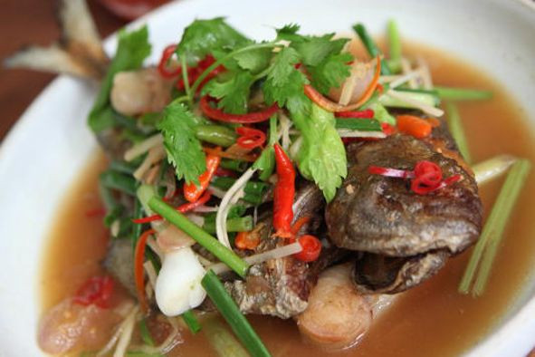 เริ่มสัมผัสถึงรสชาติความเป็นท้องถิ่นของคนสมุยอย่างแท้จริงด้วยเมนูปลาจะละเม็ดม่วนน้ำ คล้ายเมนูจีนของภูเก็ตแต่จัดจ้านกว่า วิธีการทำก็คือนำปลาจะละเม็ดมาทอดจนกรอบ เพิ่มรสชาติด้วยน้ำซอสที่มีส่วนผสมของพริกขี้หนู หอมแดง ขิง มะขามเปียก และซีอิ๊วขาว