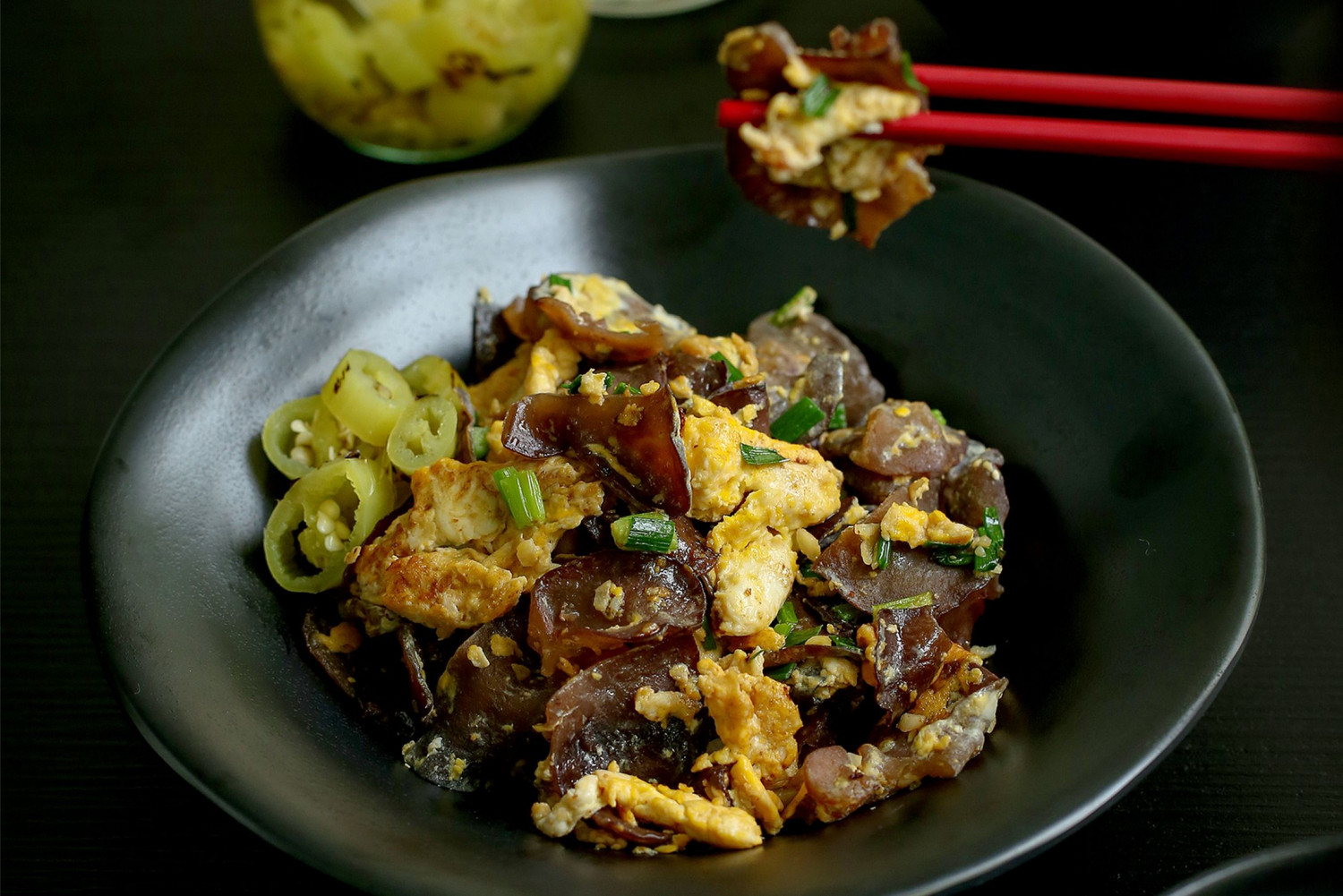 ระหว่างรอหมูกรอบที่สั่งไปเพิ่ม น้องคนเสิร์ฟเริ่มเอาอาหารจานผัดที่เขาจะผัดทีละกระทะใหญ่ๆ ใส่จานมาครั้งละหลายๆ ใบมาให้เลือกหยิบตามโต๊ะ มีมะเขือยาวผัดโหระพาบ้าง หอยลายผัดบ้าง โต๊ะเราสมาชิกเยอะ สนุกสนานกับการช็อปปิ้งของกินที่มาเสิร์ฟบนโต๊ะมากๆ เหลียวชะเง้อคอยดูว่าครั้งนี้จะเป็นอะไร เราชักงงเพราะนึกไม่ออกว่าพ่อครัวค่อยๆ ตัก “ของดำๆ” จากกระทะใส่จานนั้นคืออะไร พอน้องคนเสิร์ฟ หรือ Food Runner ของเรา ถือถาดมีอะไรสักอย่างดำๆ ในจานมาใกล้ๆ ก็ถึงบางอ้อว่ามันคือ เห็ดหูหนูผัดไข่ บางคนในโต๊ะร้องไม่อยากชิม ผู้เขียนเองก็เฉยๆ แต่ด้วยความหิวรอจานต่อไปก็ขาดตอนในการตักอาหารเข้าปาก จึงหยิบมา 1 จานจากถาดอย่างเสียมิได้