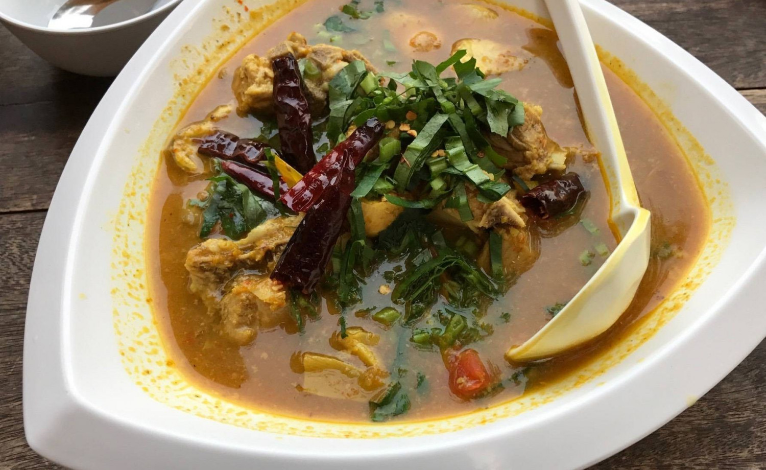เมนูเด็ดไก่เมาโค้ง ไก่บ้านเนื้อแน่นออกทางเหนียวนิดๆ ตามสไตล์เนื้อไก่บ้าน ผัดพริกใสเครื่องเทศเพิ่มความร้อนแรงเผ็ดแต่อร่อย จนสมองตื่นกันเลยทีเดียว ตามด้วยแกงส้มต้มยำ แกงส้มต้มยำชื่อและหน้าตาดูคล้ายแกงส้มแต่รสชาติมีความเป็นต้มยำสูง มีมะเขือเทศ เครื่องเทศ และหมูติดกระดูก ซดน้ำร้อนๆ อร่อยแซ่บจัดจ้านดี