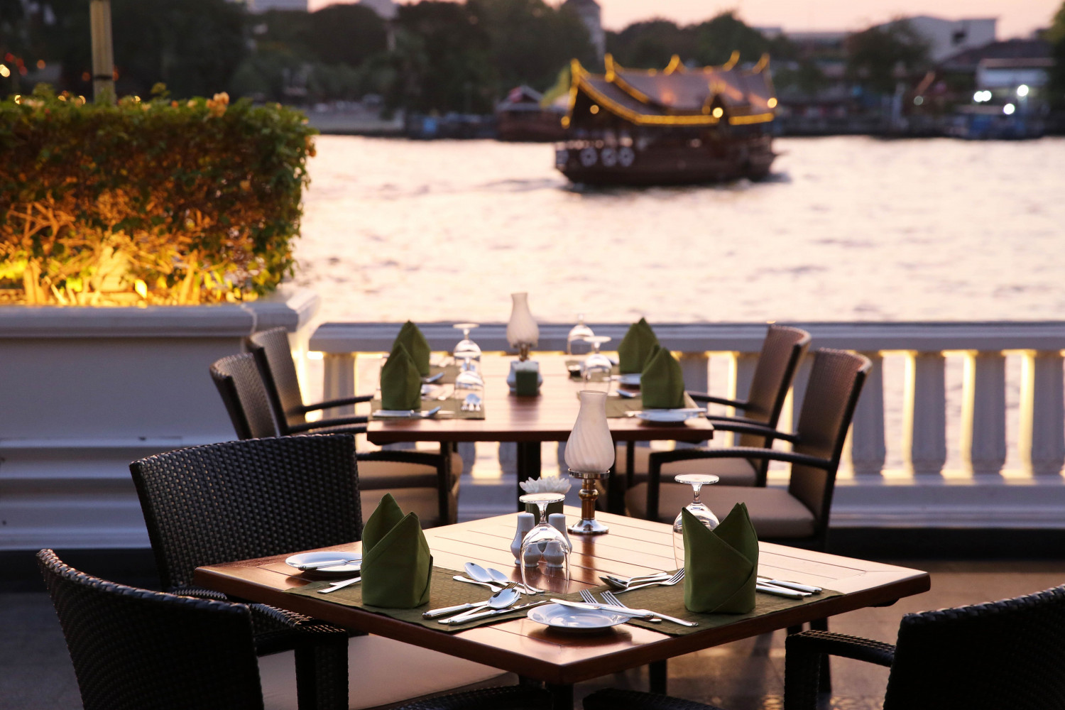 สำหรับแขกที่มาที่นี่ แนะนำว่าให้มาถึงตอนช่วงใกล้ๆ เปิดห้องอาหาร เพราะจะได้ทันเก็บบรรยากาศริมน้ำเจ้าพระยาช่วงใกล้พระอาทิตย์ลับขอบฟ้า
