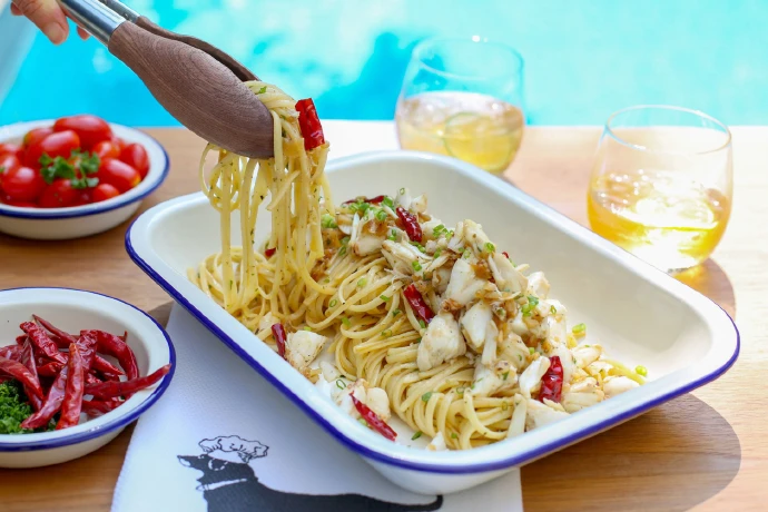 สูตรในฉบับนี้เป็นอาหารง่ายๆ ที่ปรุงบ่อยที่สุดที่บ้าน ยามที่คิดอะไรไม่ออก ส่วนผสมง่ายมีอยู่แล้วที่บ้านเป็นหลัก อาศัยแค่เนื้อปูสดๆ ที่หามาได้ สับกระเทียมจีนพอหยาบ บางครั้งถ้าสมาชิกชอบกระเทียม เราใช้หั่นแว่นๆ ใส่เยอะๆ เลยด้วยซ้ำ ขาดไม่ได้คือหอมแขกสับละเอียดเป็นพื้นฐานอาหารฝรั่งที่เขาเรียก Shallot ตรงกับบ้านเราคือหอมแขก กลิ่นและหน้าตาคล้ายหอมแดงแต่ลูกใหญ่และมีน้ำตาลเยอะกว่า กลิ่นไม่ฉุนเท่าหอมแดงลูกเล็ก ผัดแล้วหวานหอมดี ทั้งหอมแขกและกระเทียมถือเป็นสิ่งที่ขาดไม่ได้สำหรับเมนูนี้ เพราะจะทำให้น้ำมันมะกอกของเราหอมยิ่งขึ้นเมื่อผัดเคล้ากับเส้นพาสต้า