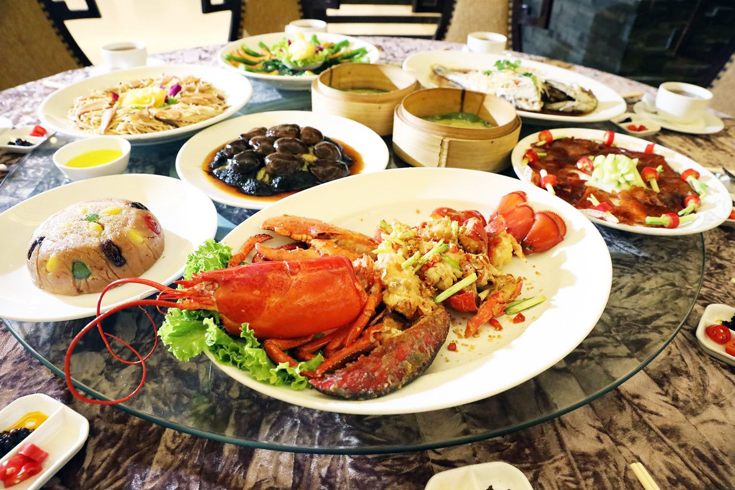 มาถึงจานไฮไลต์อย่าง “เป็ดอิ่มหนำสำราญ” เป็ดปักกิ่งหนังกรอบนุ่ม ได้รับการเลี้ยงดูพิเศษด้วยกรรมวิธีเฉพาะที่เรียกว่า “เถียนยา” ซึ่งคำนี้มีความหมายว่าขุนให้อ้วนนั่นเอง เมนู “กุ้งมังกรนำพาบารมี” เสิร์ฟลาภยศตำแหน่งที่เฝ้าปรารถนาพร้อมกับกุ้งมังกรสดอร่อยเกินบรรยาย ผัดพริกเกลือคลุกเคล้าเครื่องปรุงจนได้ที่ ปิดท้ายด้วย “หวานร่มเย็น” หรือโอนีแปะก๊วย เมนูขนมหวานมงคลของชาวจีน อำนวยอวยชัยให้มีลูกมีหลานเต็มบ้านเต็มเมือง และเกื้อหนุนกันให้เจริญรุ่งเรือง เซต 8 เมนูพิเศษฉลองตรุษจีน ราคา 8,900 บาท