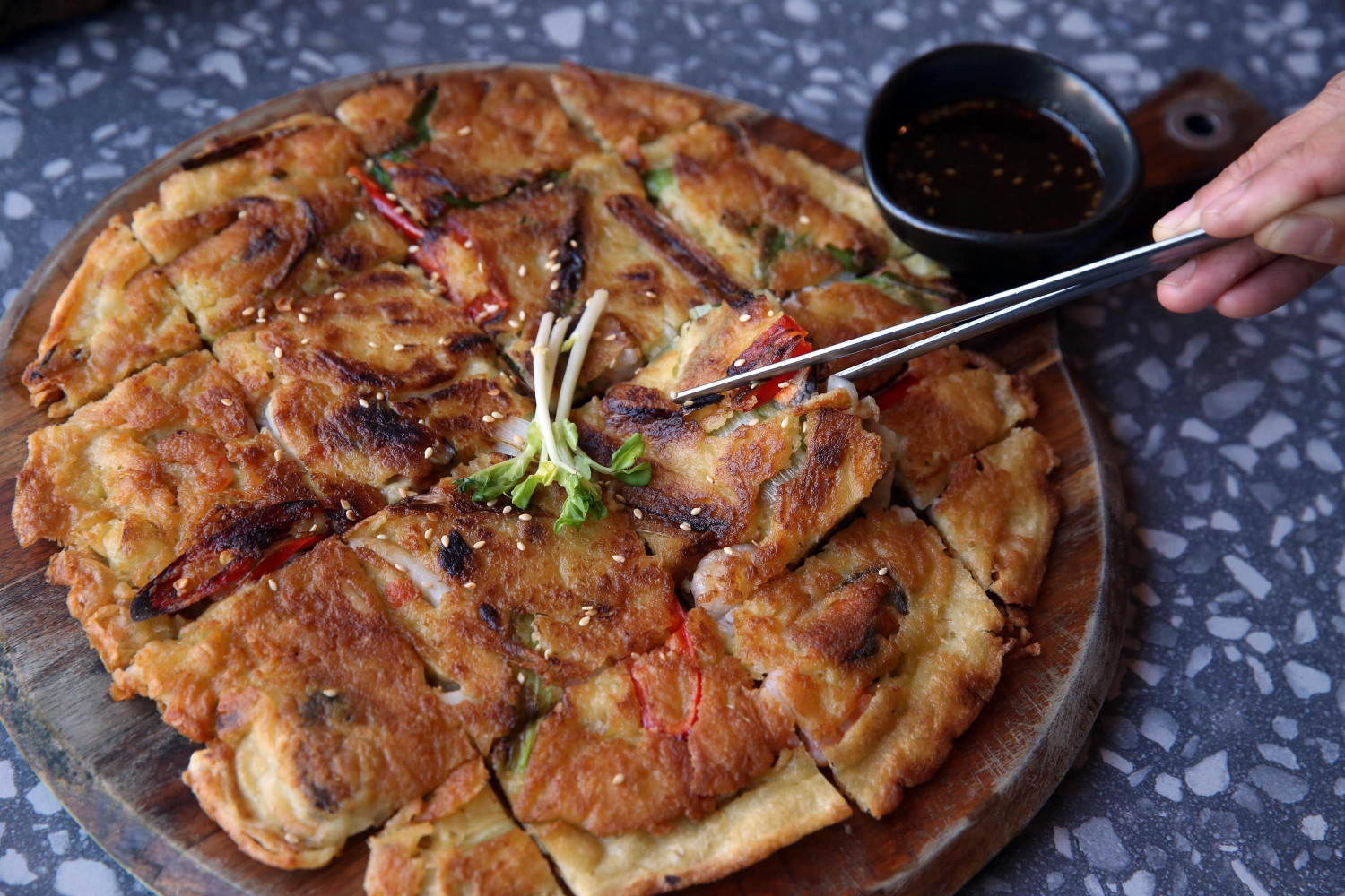 คนชอบกินหอยทอดห้ามพลาดเมนูนี้ Haemui Pajeon พิซซ่าเกาหลีทะเล เหมือนกับหอยทอดในบ้านเรา แต่ใช้แป้งคนละอย่างกัน แป้งที่ใช้เหมือนกับแป้งแพนเค้ก อันนี้พิเศษตรงที่มีไส้เป็นซีฟู้ดเน้นๆ สมกับเป็นแพนเค้กข้าวสูตรปูซาน เมืองที่เต็มไปด้วยอาหารทะเลชั้นเลิศ ทอดจนกรอบนอกนุ่มใน เพิ่มรสชาติด้วยซอสสูตรเฉพาะของทางร้าน รสชาติออกเผ็ด เค็ม