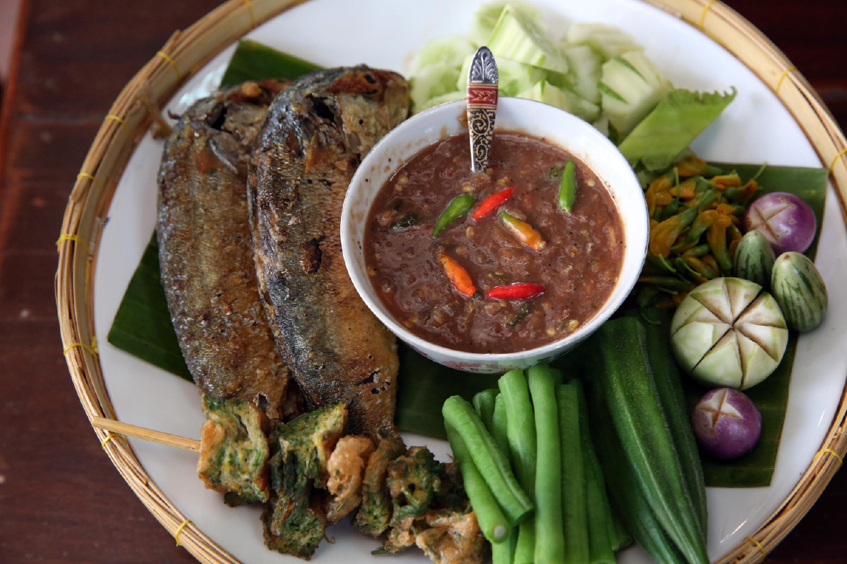 เริ่มต้นที่สำรับประจำวัน เป็นชุดสำรับที่ประกอบไปด้วย น้ำพริกกะปิปลาทู คุณยายจะเลือกใช้กะปิสองคลอง หรือกะปิคลองด่าน จ.สมุทรปราการ ที่ทางญาติทำส่งตามโรงแรม ให้เนื้อละเอียดสีเข้ม โขลกตำกับพริกขี้หนูสวน พร้อมเพิ่มรสชาติด้วยน้ำมะนาว และเพิ่มความจัดจ้านด้วยพริกลูกโดดสำหรับคนที่ชอบรสจัด กินกับปลาทูทอดตัวเขื่อง และผักเคียงตามฤดูกาล เสิร์ฟมาพร้อมกับข้าวสวยร้อนๆ โอ๊ย... อร่อยอย่าบอกใคร