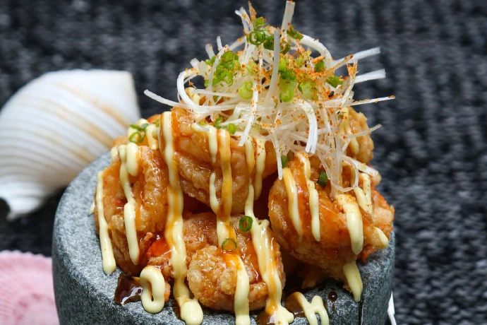 สำหรับในฉบับนี้เป็นกุ้งชุบแป้งทอดที่เอาวิธีทอดแบบฝรั่งมารับประทาน แต่เอามาราดซอสหลากหลาย ได้ไอเดียจากร้านอาหารญี่ปุ่นในอเมริกา ที่ผสมผสานเอาวิธีการชุบแป้งแห้งลงทอดจนกรอบเหลือง แป้งชุบทอดติดที่ชิ้นอาหารทะเลพอประมาณให้พอได้ความกรอบๆ มันๆ ก่อนที่จะราดด้วยมายองเนส ซอสโชยุหวาน ที่เรียก Nitsume Shoyu ซึ่งเป็นซอสที่มีโชยุหรือซีอิ๊วญี่ปุ่นเป็นพื้นฐานผสมกับน้ำตาลทราย มิริน สาเก และเพิ่มความหอมด้วยดาชิหรือปลาโอแห้งขูด ยังเพิ่มความแปลกสำหรับเราชาวเอเชียคือ ราดซอสพริกศรีราชาผสมลงไปด้วย ไม่ใช่เพียงเพื่อความสวยงามให้จานอาหารที่ดูเนื้อกุ้งกรอบๆ เคลือบด้วยซอส 3 สีดูฉ่ำแล้ว ยังช่วยให้รสชาติมีทั้งเค็มมันจากมายองเนส หวานๆ เค็มๆ จากซอสนิซึเมะและยังเปรี้ยวๆ เผ็ดๆ จากซอสพริก