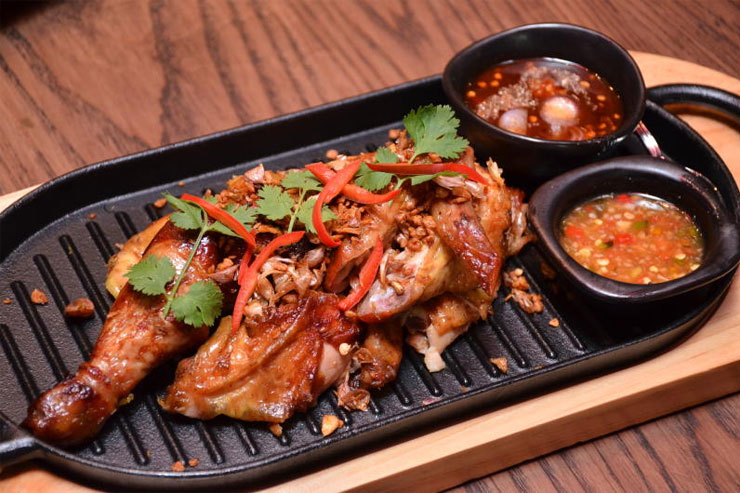 ต่อด้วยเมนูซิกเนเจอร์ ไก่ย่างไพเรท ไก่ย่างสูตรลับของเจ้าของร้านที่ใช้ไก่บ้านสายพันธุ์ญี่ปุ่นนามว่า ทิโดริ ที่ทั้งนุ่มชุ่มฉ่ำ และหนังกร๊อบกรอบถึงใจ เคล็ดลับอยู่ที่ต้องเลือกไก่ขนาดกำลังดี นำมาหมักกับสมุนไพร ตะไคร้ ขมิ้น และน้ำซอสสูตรพิเศษของทางร้าน ย่างด้วยเตาพิเศษที่สั่งตรงจากฝรั่งเศส